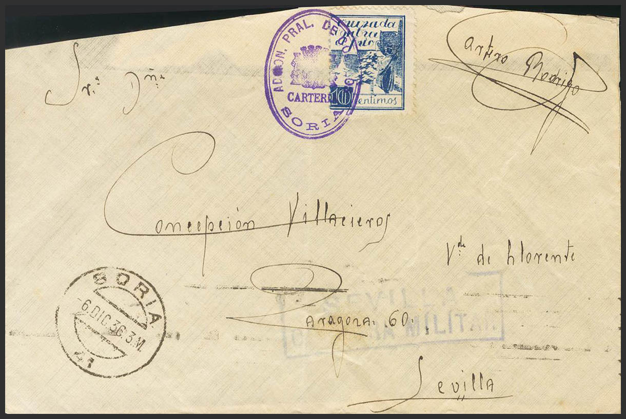 1936. 10 cts azul CRUZADA CONTRA EL FRIO. SORIA a SEVILLA (falta parte de la esquina izquierda sin importancia). Matasello ADMON. PRAL. DE CORREOS / CARTERIA / SORIA y manuscrito "Cartero Rodrigo". MAGNIFICA Y RARISIMA, ESPECIALMENTE CON ESTA ESPECTACULARIDAD.