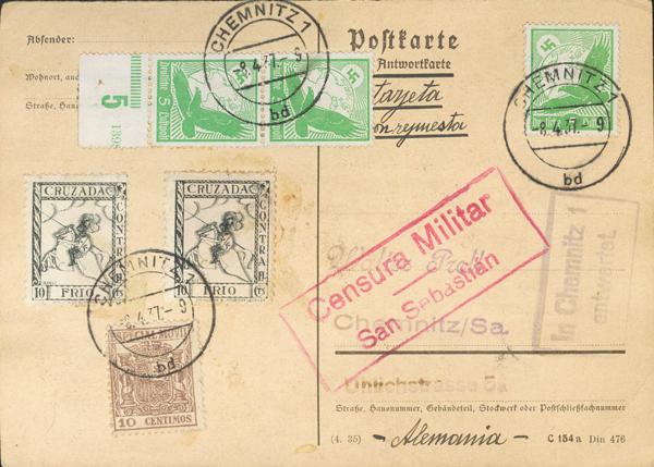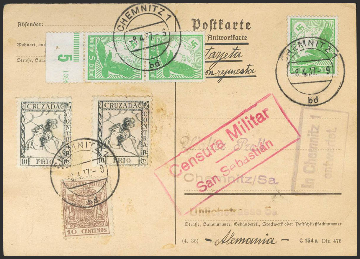 1937. Remitida desde el crucero Leipzig y dirigida a KIEL (ALEMANIA). Marca KOMMANDO / KREUZER "LEIPZIG" y fechador DEUTSCHE KRIEGSMARINE / NR32 (este buque participó como neutral en la Guerra Civil Española y sufrió algunos ataques con torpedos por parte de la aviación soviética en 1937) (en el interior contiene un tarjetón con sellos españoles). MAGNIFICA.