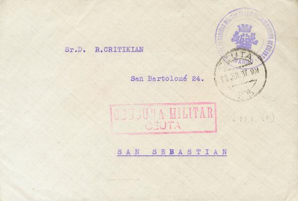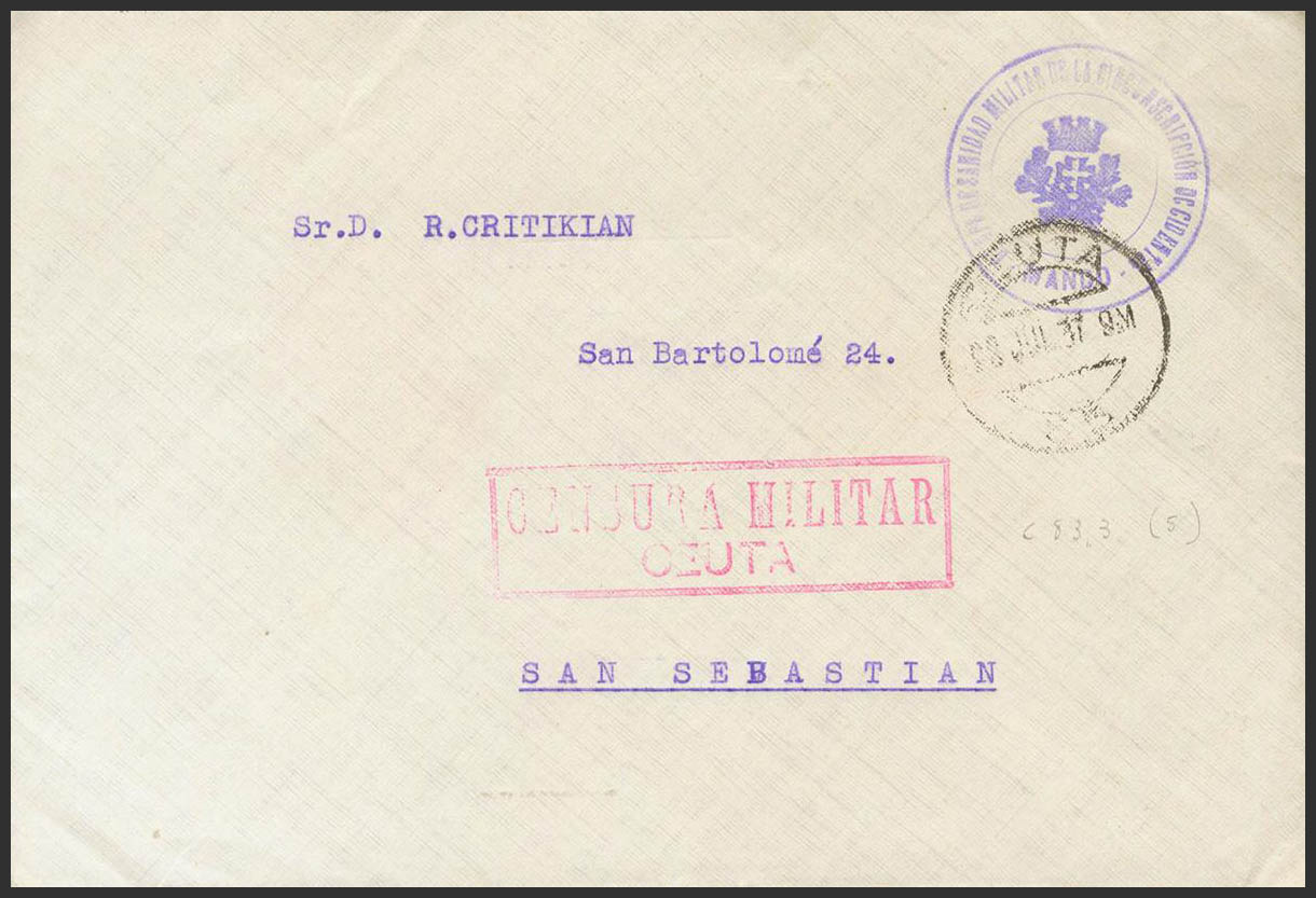 (1936ca). Sobre de "Frentes y Hospitales" de la "División Navarra" a CORDOBA (ARGENTINA). Marcas E.M. / CUERPO EJERCITO DE NAVARRA / CENSURA MILITAR, ambas en violeta y al dorso llegada. MAGNIFICA Y RARA.