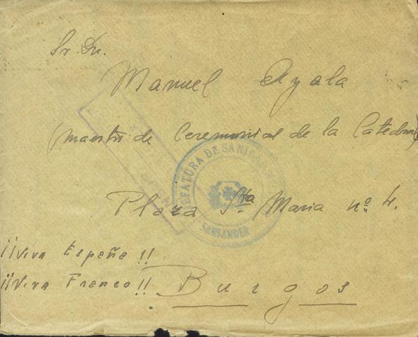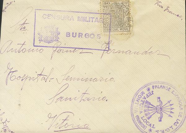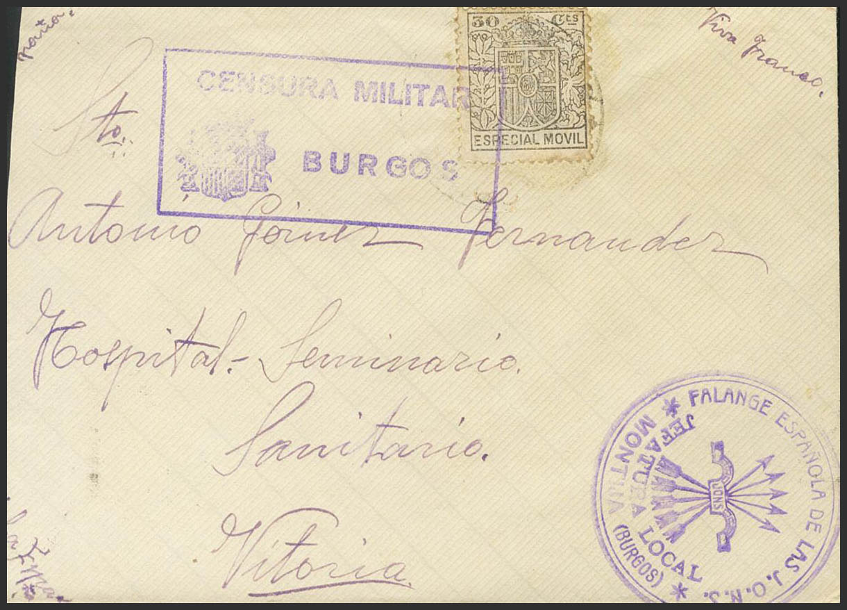 1937. Carta (con texto) de SANTANDER a BURGOS. Marca de franquicia JEFATURA DE SANIDAD MILITAR / SANTANDER, en azul. MAGNIFICA Y RARA.