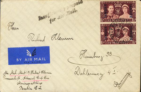 1937. (26 de Abril). 12 p carmÃn de Alemania. BERLIN a KONIGSBERG, enviada a través de la embajada alemana hasta BerlÃn, donde se franquea con el sello alemán para ocultar el origen de la correspondencia de la Legión Cóndor. MAGNIFICA Y MUY RARA.