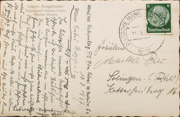 1937. 6 p verde de Alemania. Tarjeta Postal (con imagen del crucero Admiral Scheer en Funchal, Madeira) dirigida a SOLINGEN (ALEMANIA). Matasello DEUTSCHE MARINE SCHIFFPOST / Nº29, este buque participó en el llamado Comité de No Intervención. MAGNIFICA.
