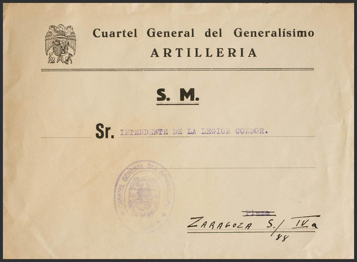 (1939ca). Dirigida al Intendente de la Legión Cóndor, en ZARAGOZA (en lugar de la calle aparecen las claves que utilizaban a modo de contraseña). Marca CUARTEL GENERAL DEL GENERALISIMO / *ARTILLERIA*, en violeta. MAGNIFICA.