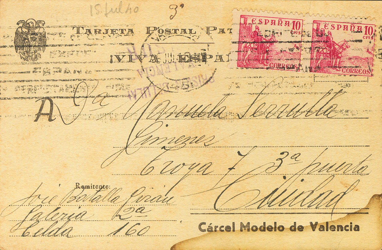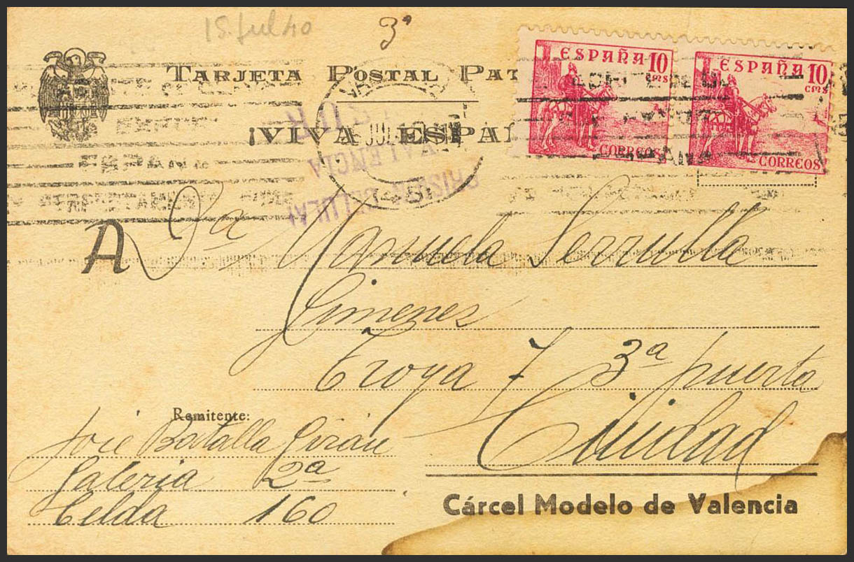 917(2). 1940. 10 cts rosa, dos sellos. Tarjeta Postal con el membrete CARCEL MODELO DE VALENCIA del Correo Interior de Valencia. En el frente marca PRISION CELULAR / VALENCIA / CENSURA, en violeta. MAGNIFICA Y MUY RARA.