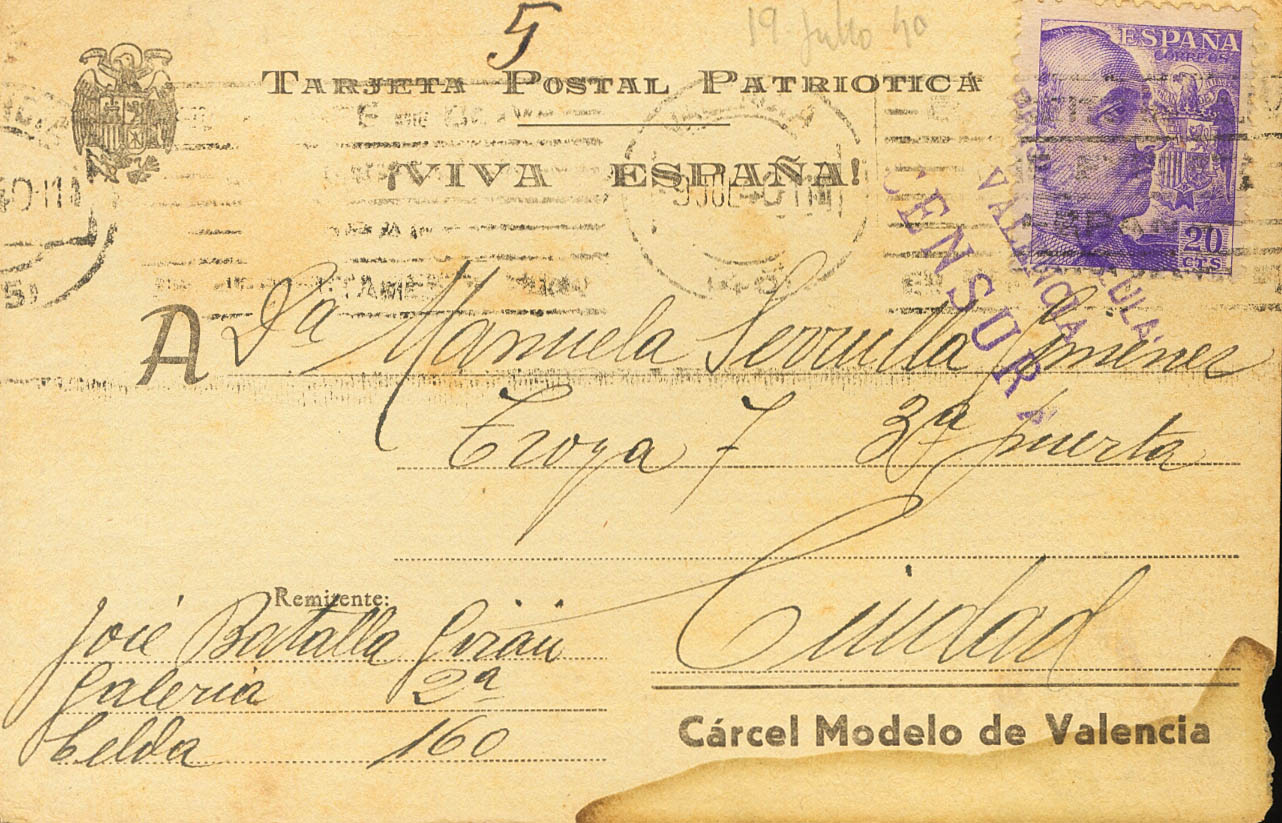 922. 1940. 20 cts violeta. Tarjeta Postal con el membrete CARCEL MODELO DE VALENCIA del Correo Interior de Valencia. En el frente marca PRISION CELULAR / VALENCIA / CENSURA. MAGNIFICA Y RARA.