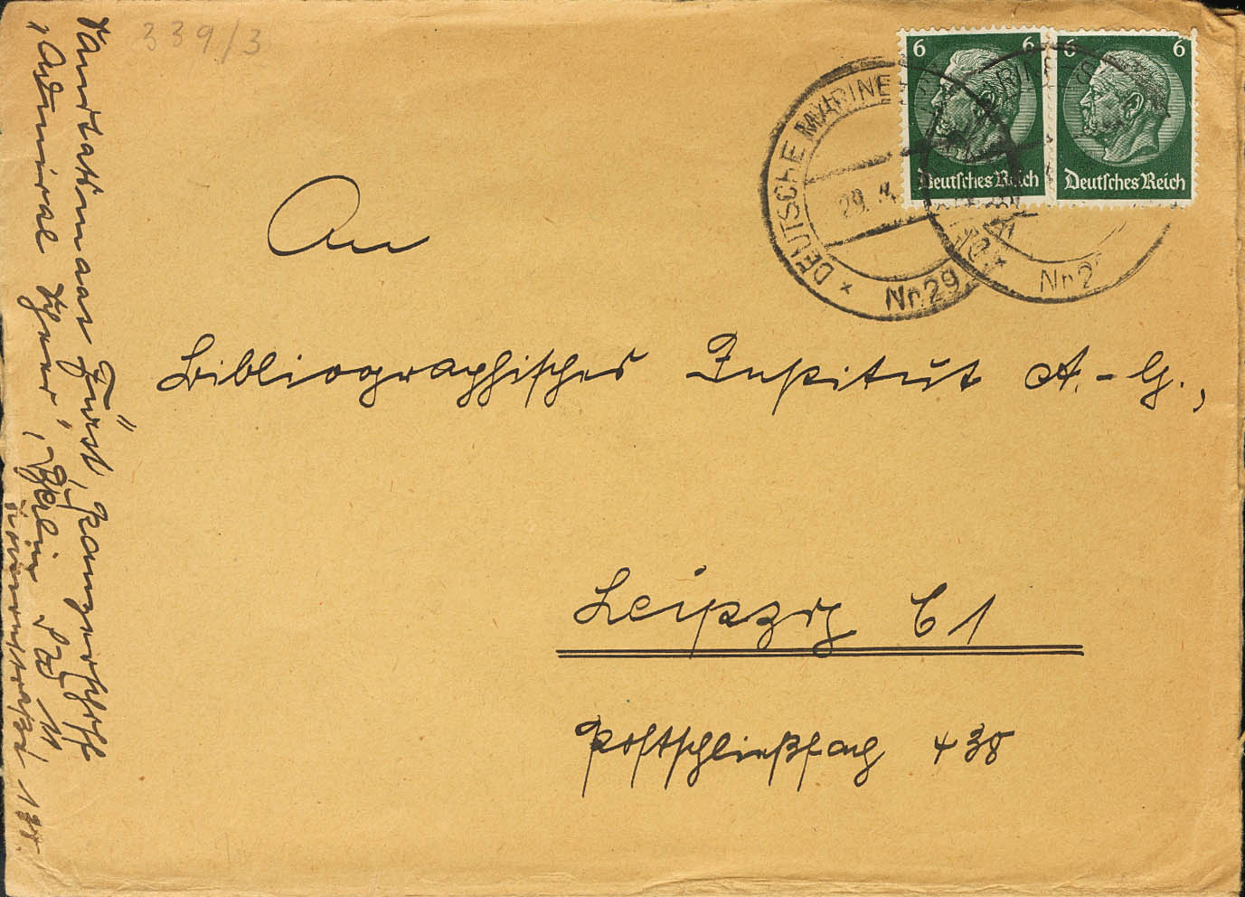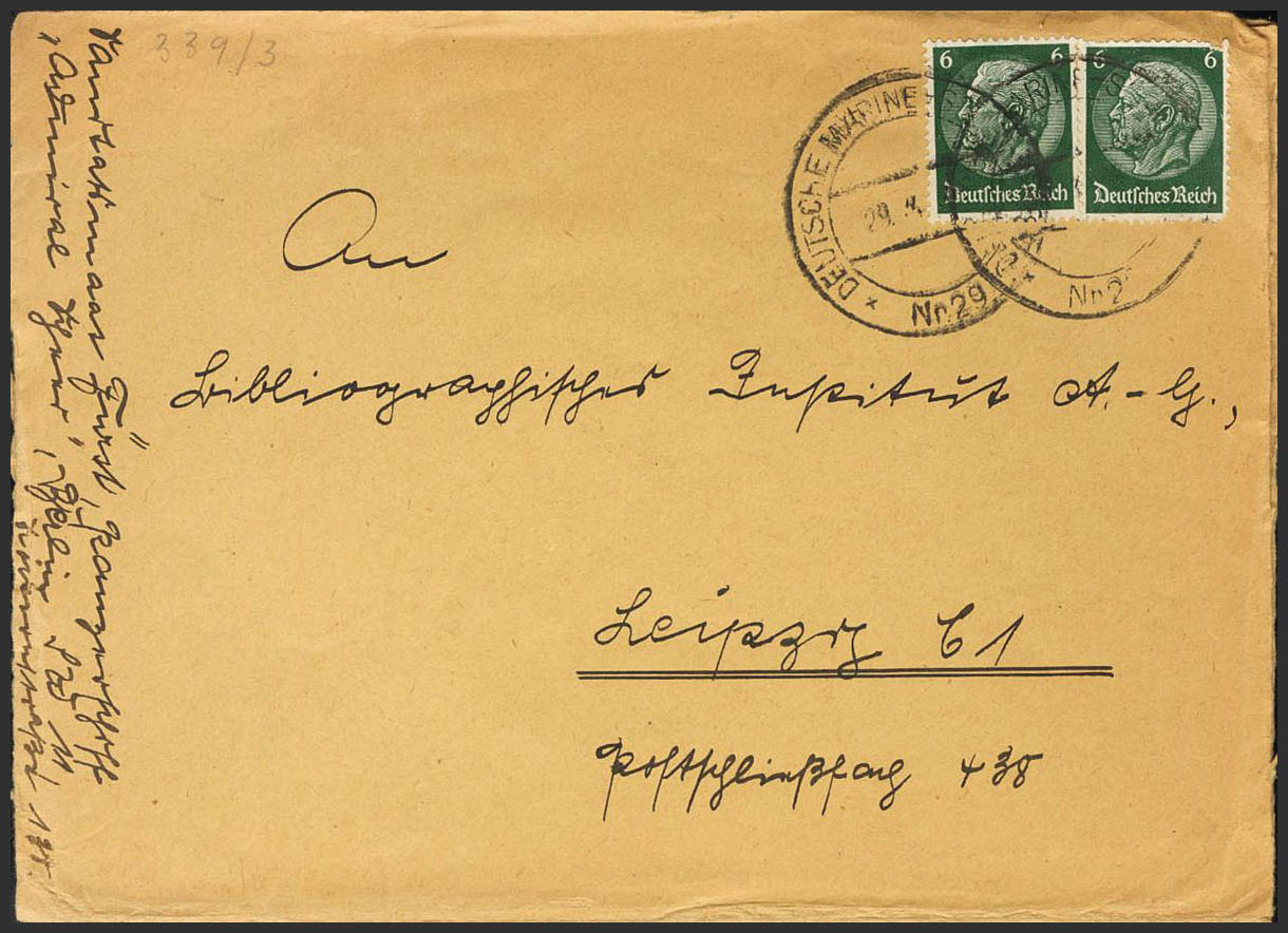 1938. 6 p verde de Alemania, dos sellos. Remitida desde el acorazado Admiral Scheer y dirigida a LEIPZIG (ALEMANIA). Matasello DEUTSCHE MARINE SCHIFF / NR29 (este buque fue el que bombardeó AlmerÃa en respuesta al ataque que sufrió el Acorazado Deutschland). MAGNIFICA Y RARA.