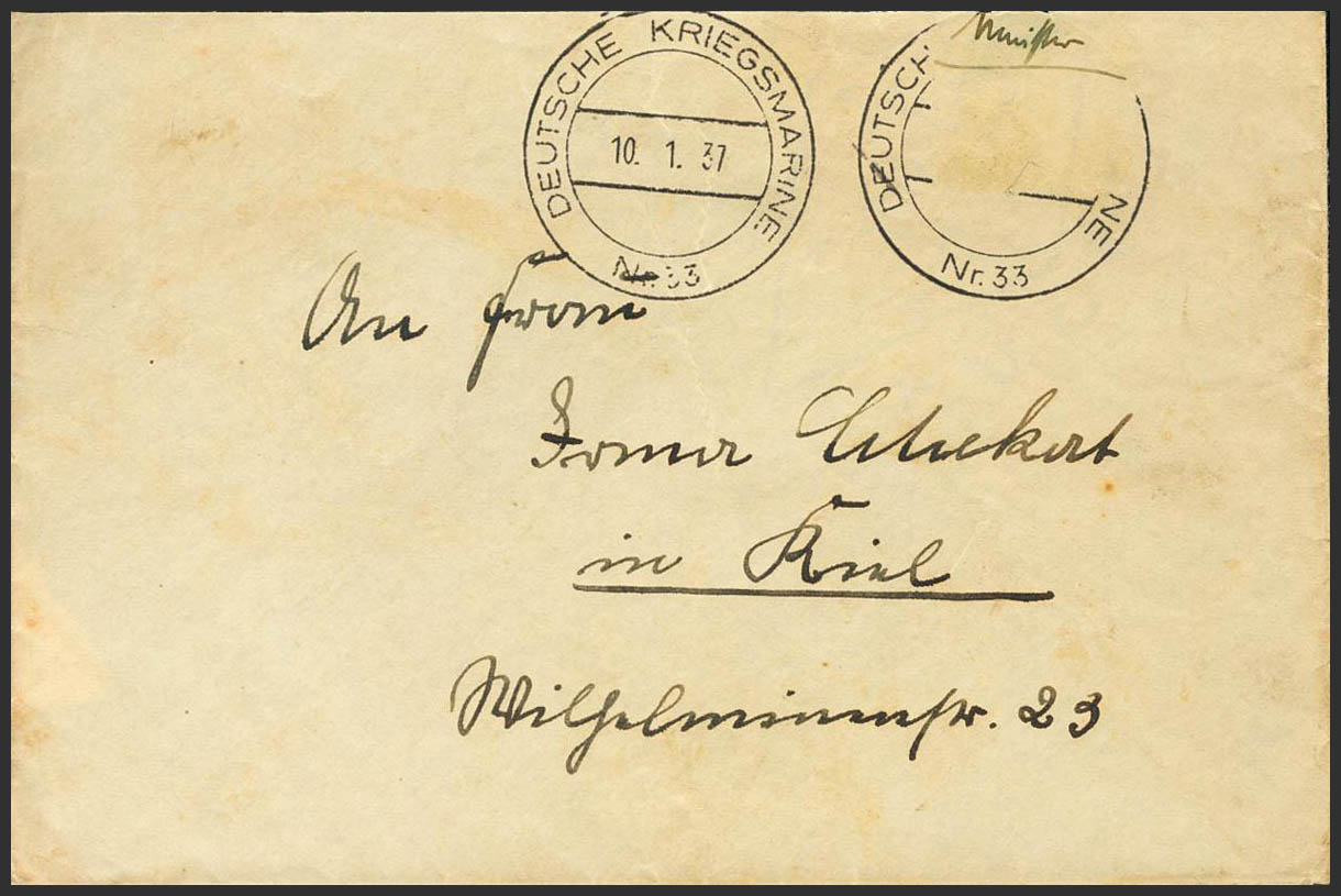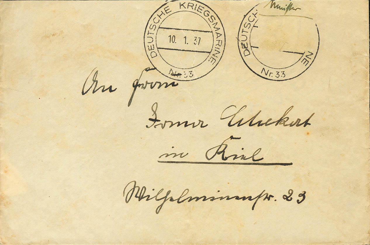 1937. Remitida desde el Crucero Karlsruhe (sello desprendido durante el trayecto) y dirigida a KIEL (ALEMANIA). Matasello DEUTSCHE KRIEGSMARINE / Nº33 y al dorso marca en seco KREUZER KARLSRUHE (este buque participó en la Guerra Civil Española como buque neutral entre 1936 y 1938). MAGNIFICA.