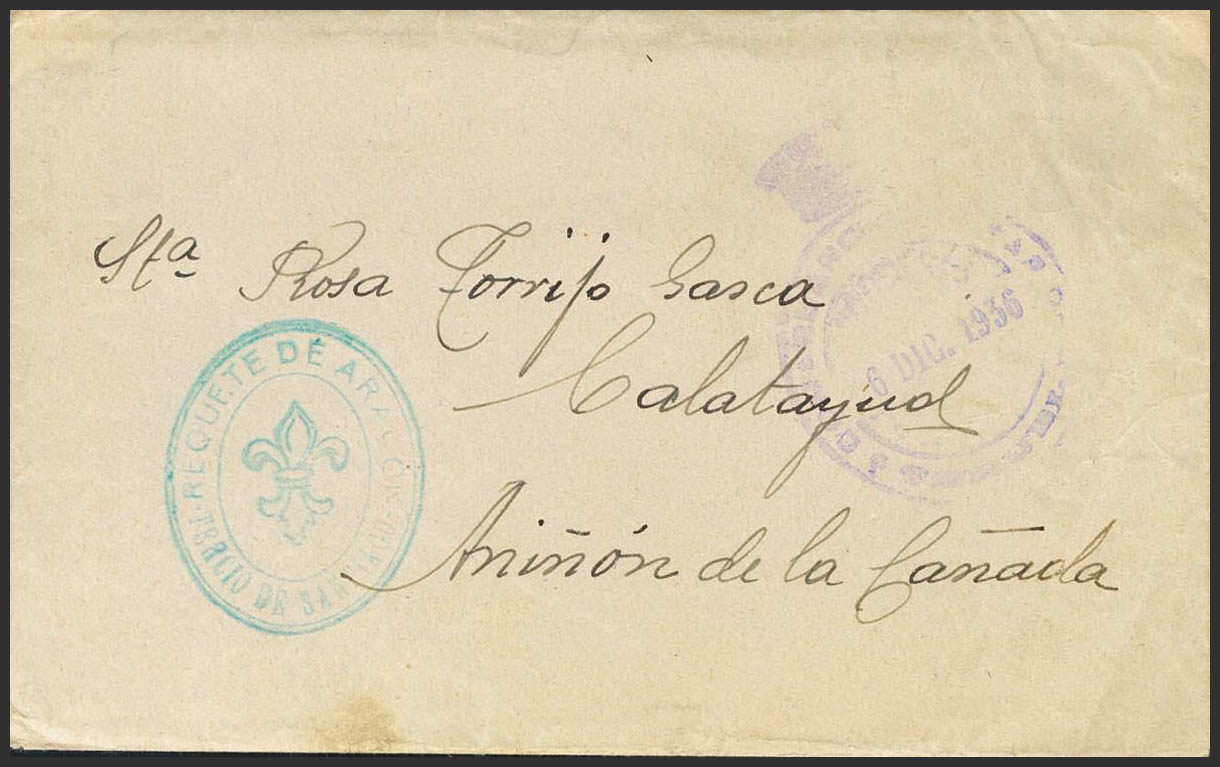 1936. (6 de Noviembre). Carta (con texto) de VILLASTAR (TERUEL) a ANIÑON (ZARAGOZA), remitida por un teniente de Requetés del Tercio de Santiago y en el interior membrete REQUETE DE ARAGON-TERCIO DE SANTIAGO MANDO. Marcas de franquicia COMANDANCIA MILITAR/ TERUEL, en violeta y REQUETE DE ARAGON / TERCIO DE SANTIAGO, en azul. MAGNIFICA Y MUY RARA.