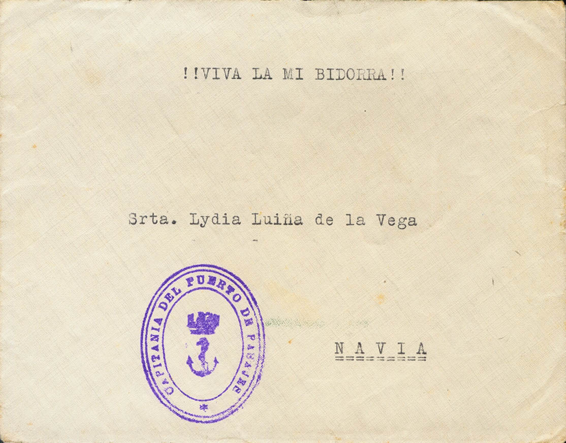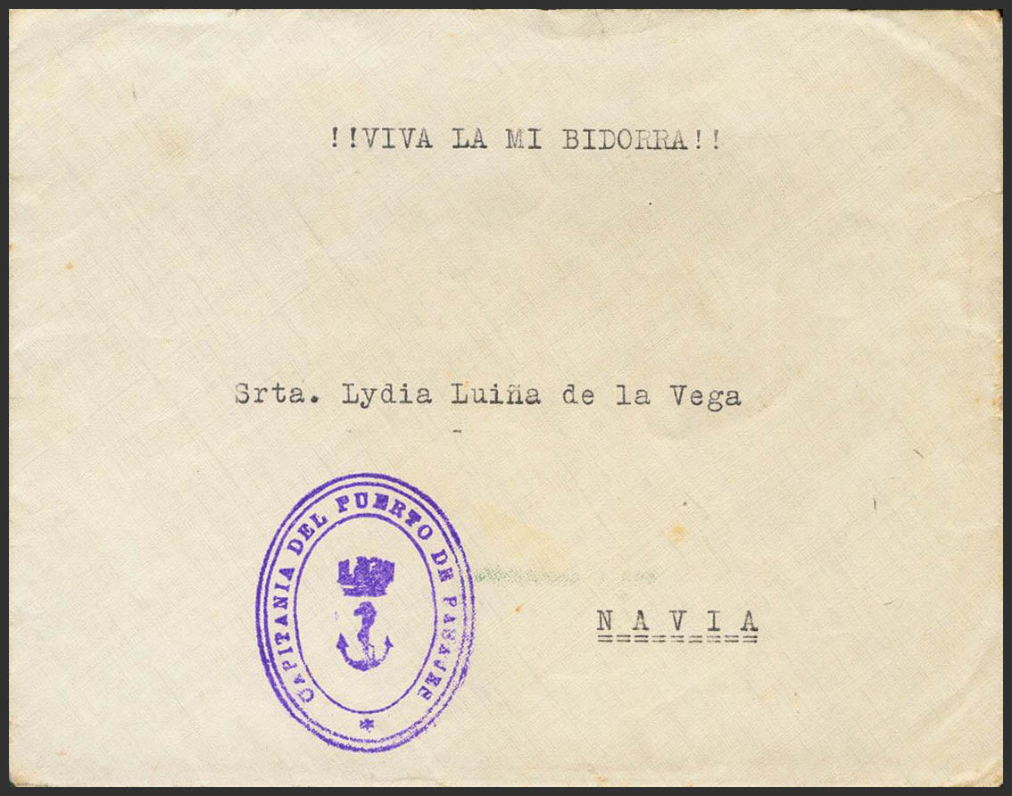 (1937ca). PASAJES (GUIPOZCOA) a NAVIA. Marca de franquicia (repetida al dorso) CAPITANIA DEL PUERTO DE PASAJES, en violeta. MAGNIFICA Y RARA.