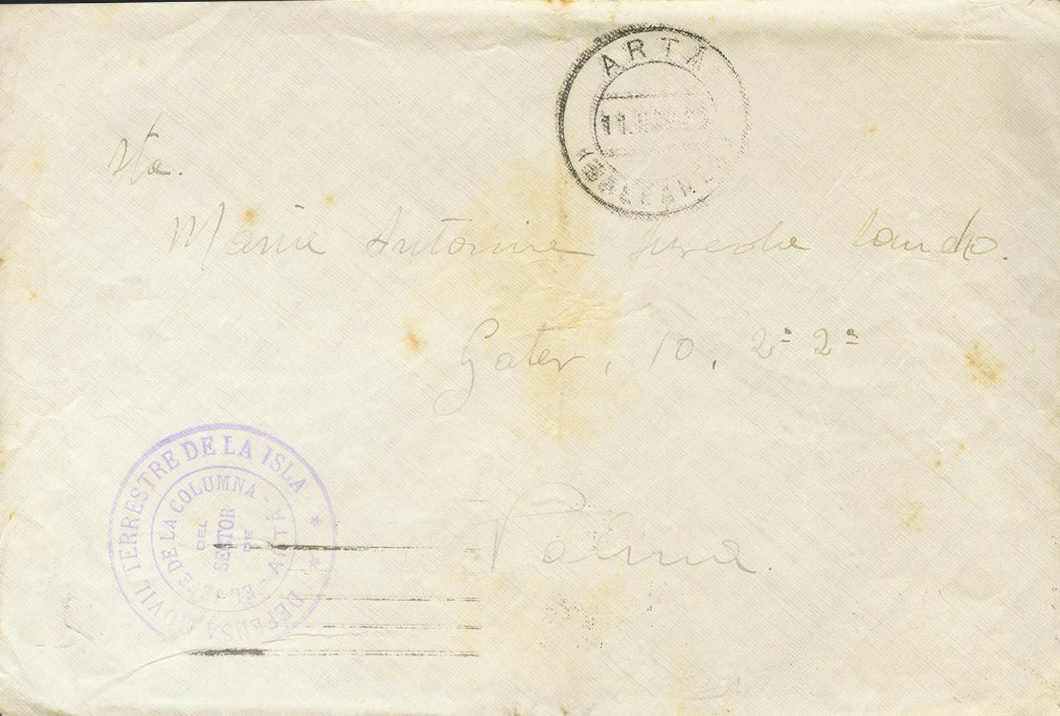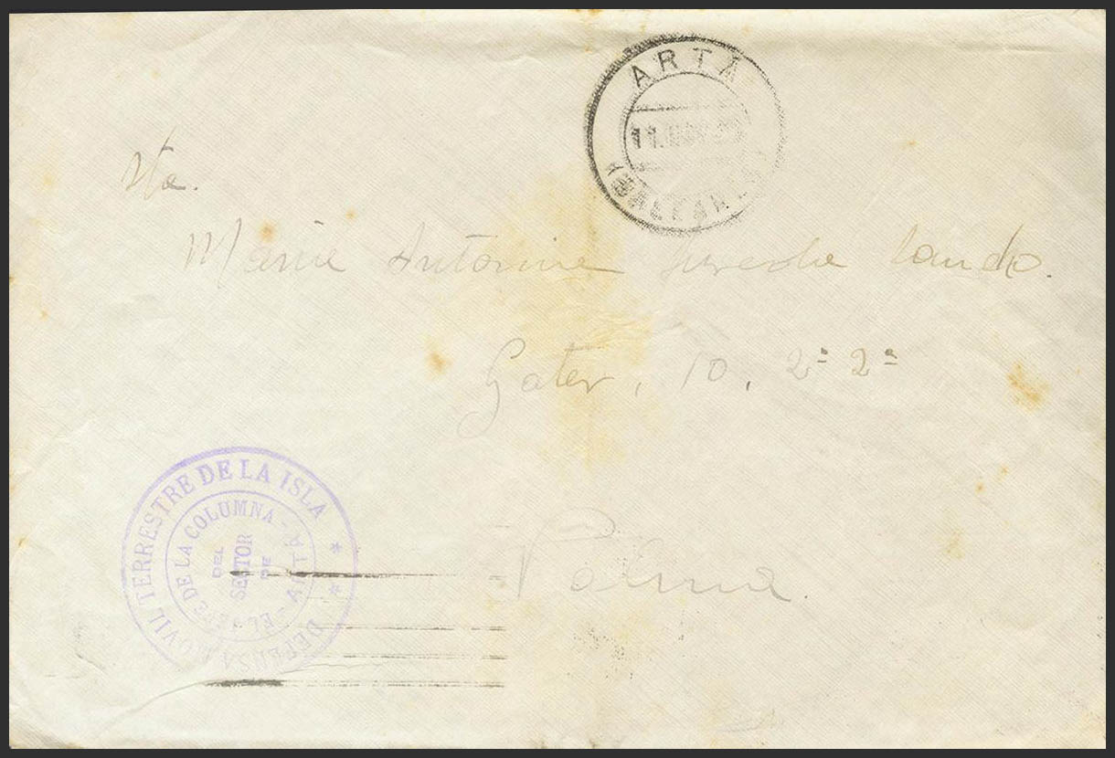 1936. Carta (con texto) de ARTA (BALEARES) a PALMA DE MALLORCA. Marca de franquicia DEFENSA MOVIL TERRESTRE DE LA ISLA / EL JEFE DE LA COLUMNA / DEL / SECTOR / DE ARTA, en violeta y al dorso llegada. MAGNIFICA Y MUY RARA.