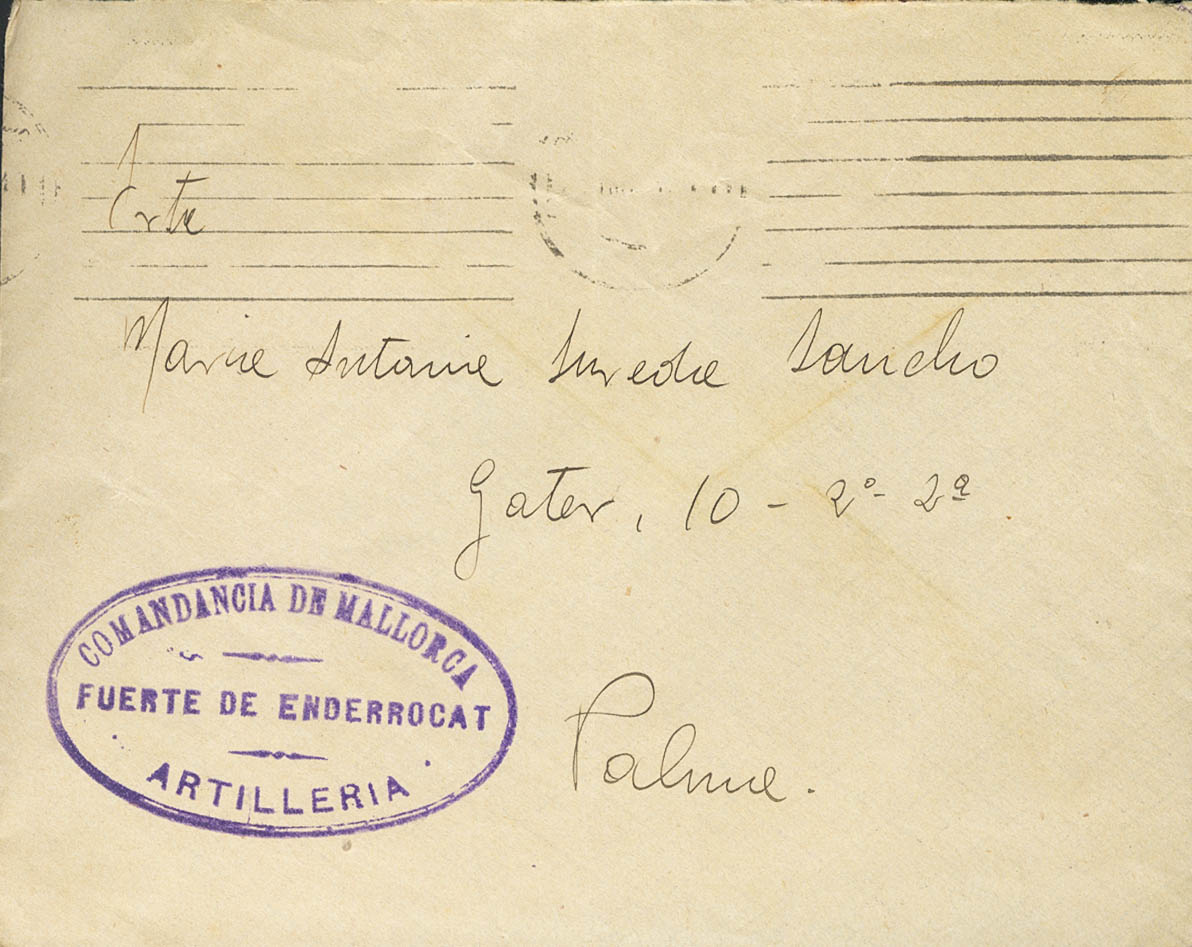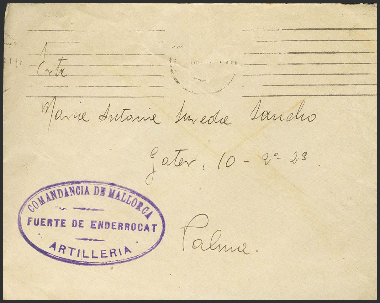 1936. Carta (con texto) de CABO ENDERROCAT (BALEARES) a PALMA DE MALLORCA. Marca de franquicia COMANDANCIA DE MALLORCA / FUERTE DE ENDERROCAT / ARTILLERIA, en violeta. MAGNIFICA Y MUY RARA.