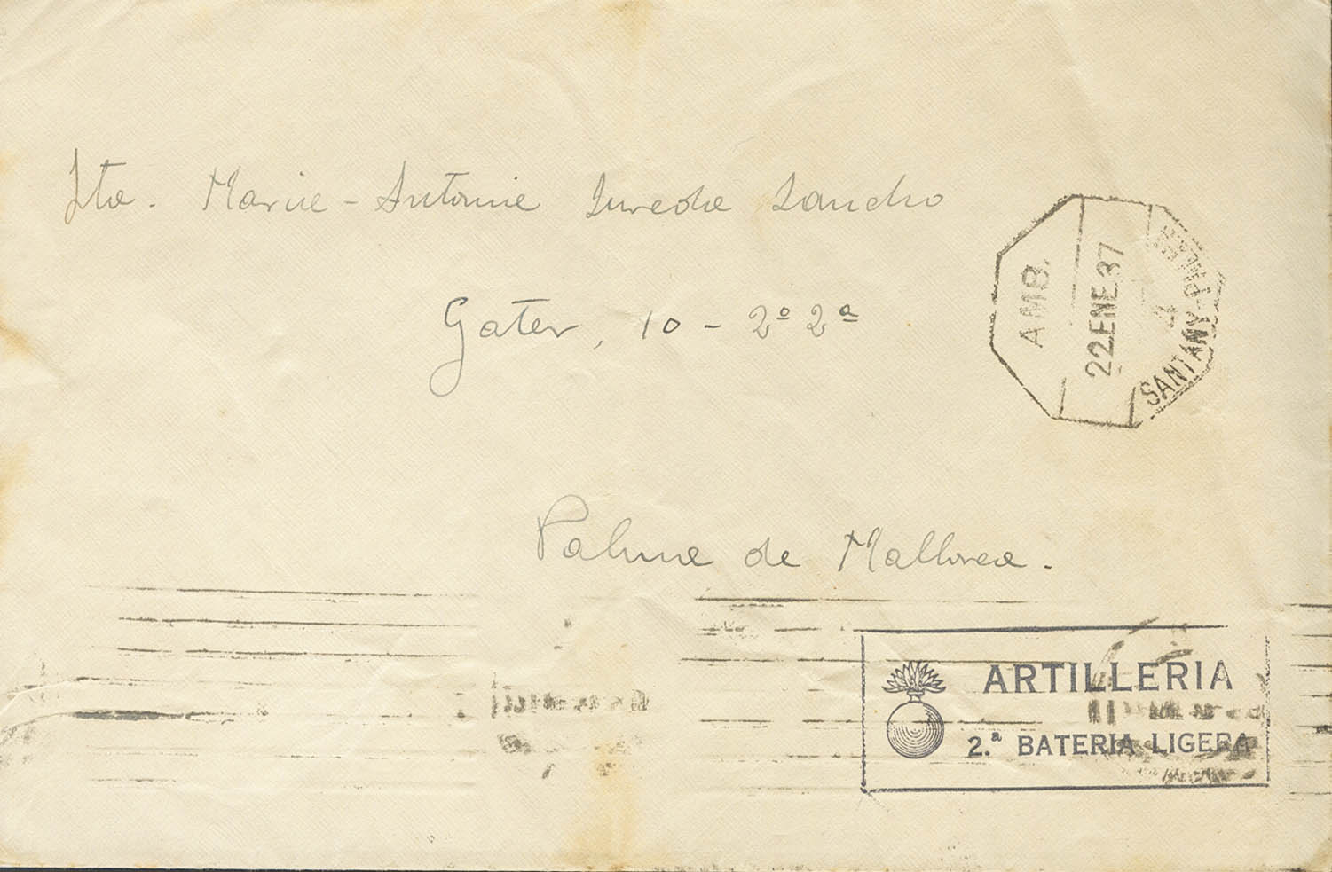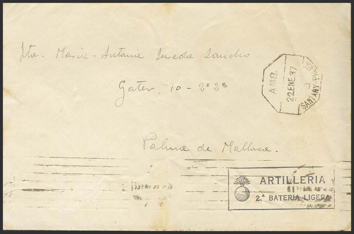 1937. Carta (con texto) de PUNTA LLOBERA (BALEARES) a PALMA DE MALLORCA. Marca de franquicia ARTILLERIA / 2ª BATERIA LIGERA y fechador ambulante AMB / SANTANY-PALMA, al dorso llegada. MAGNIFICA Y RARA.