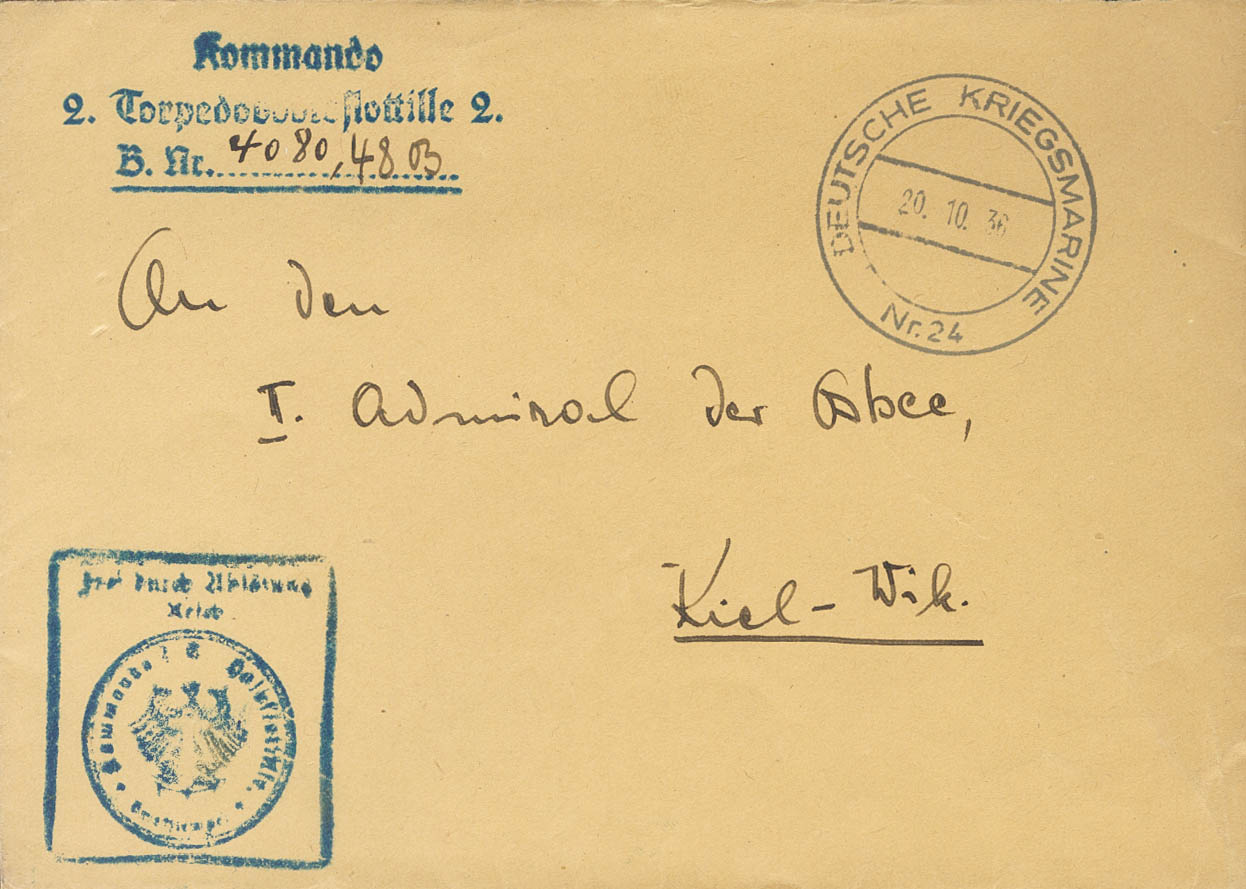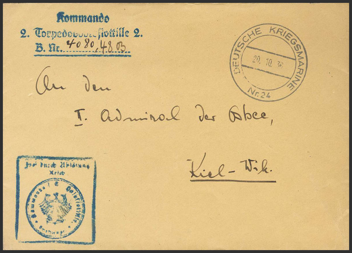 1936. Dirigida a KIEL (ALEMANIA). Sobre de un torpedero alemán del KOMMANDO 2 TORPEDOBOOTS FLOTILLE 2, marca en azul y fechador DEUTSCHE KRIEGSMARINE / NR.24, este buque fue uno de los que participó en la protección y control de material bélico de las tropas del bando nacional, en el llamado Comité de No Intervención. MAGNIFICA Y RARA.