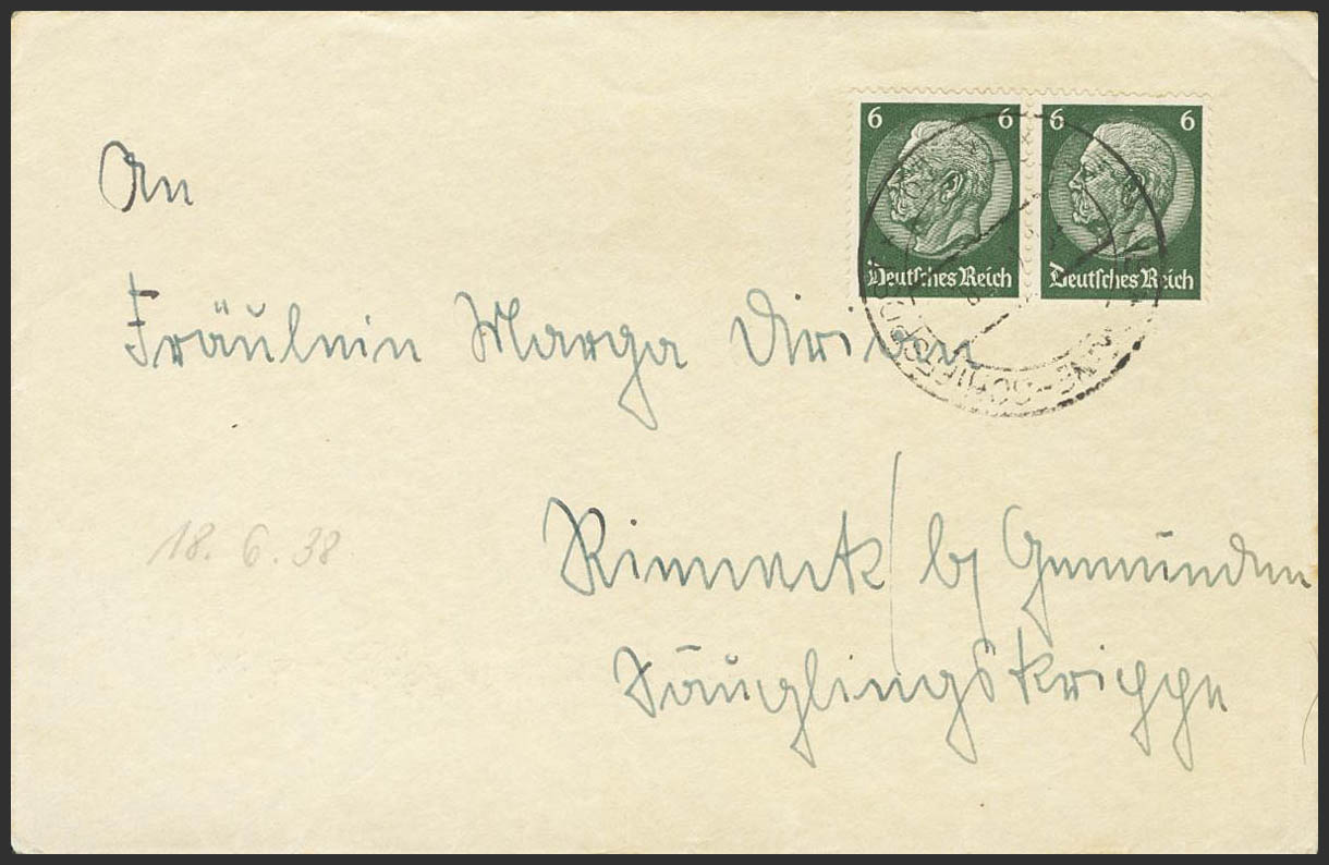 1938. 6 p verde de Alemania, pareja. Carta con texto y membrete remitida desde el Acorazado Admiral Scheer y dirigida a ALEMANIA. Matasello DEUTSCHE MARINE-SCHIFFPOST / Nº29, uno de los barcos enviados por Alemania para la protección y control de material bélico a las tropas del bando nacional, en el llamado Comité de No Intervención. MAGNIFICA Y RARA.