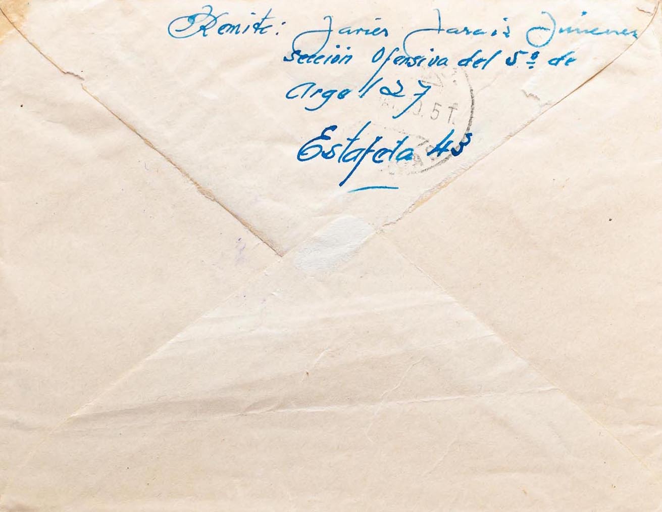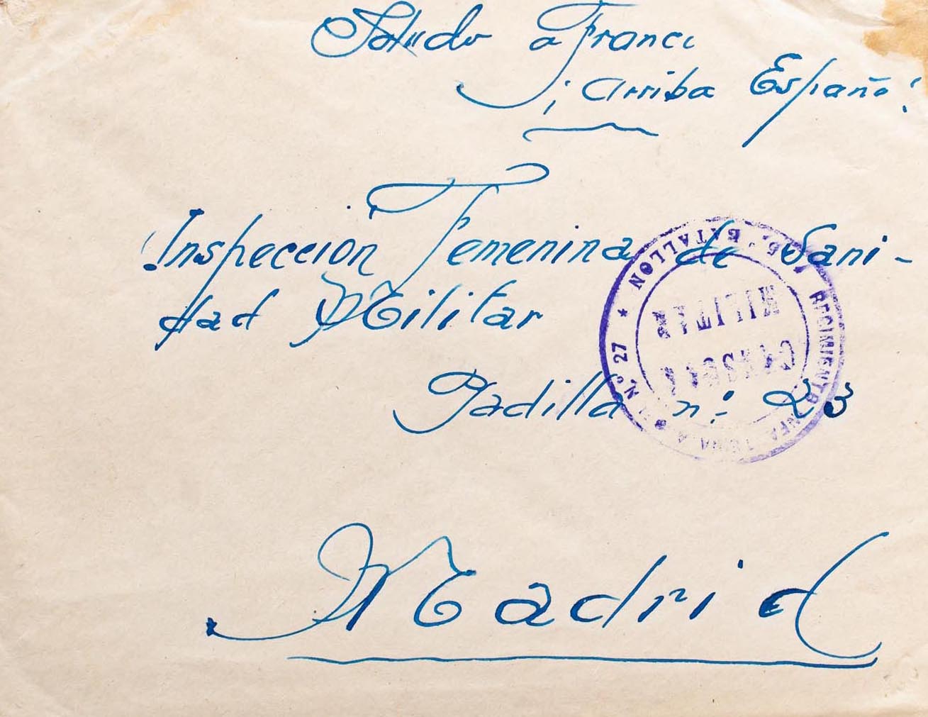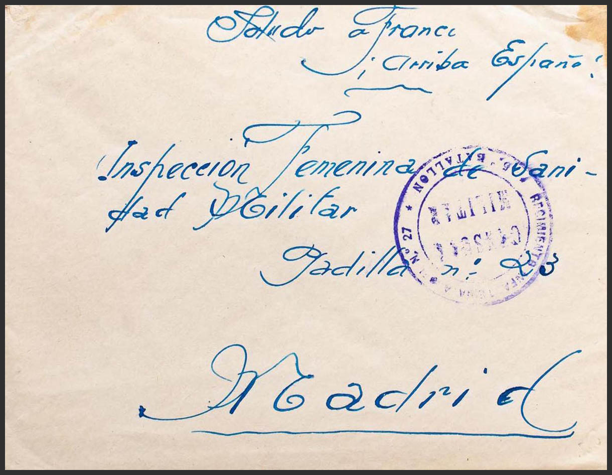 1939. Dirigida a MADRID. Marca REGIMIENTO INFANTERIA ARGEL Nº27 / 5º BATALLON, en violeta y al dorso llegada. MAGNIFICA Y RARA.