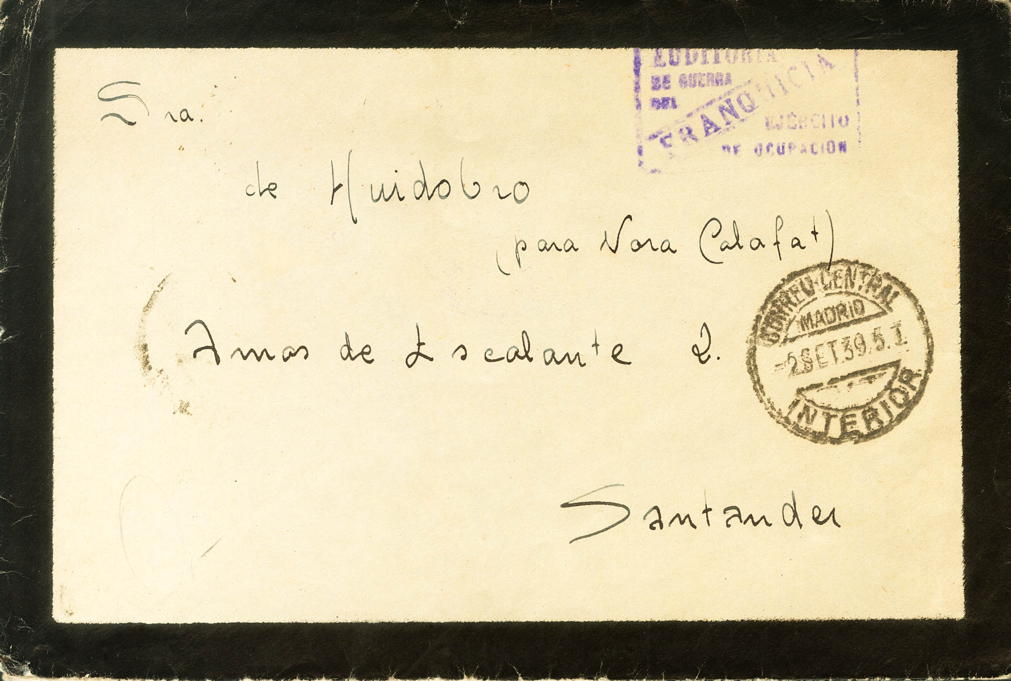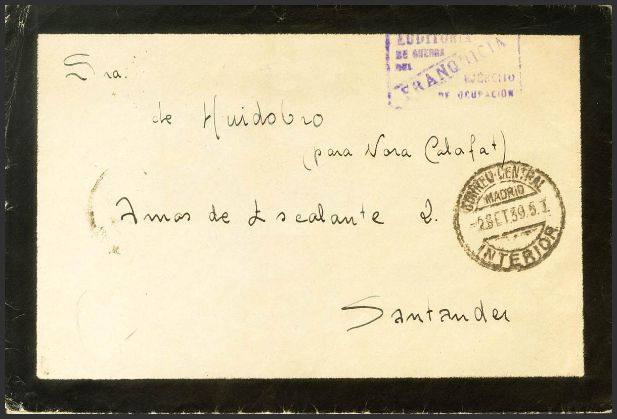1939. MADRID a SANTANDER. Marca de franquicia AUDITORIA / DE GUERRA / DEL / EJERCITO / DE OCUPACION, en violeta y al dorso llegada. MAGNIFICA Y RARA.
