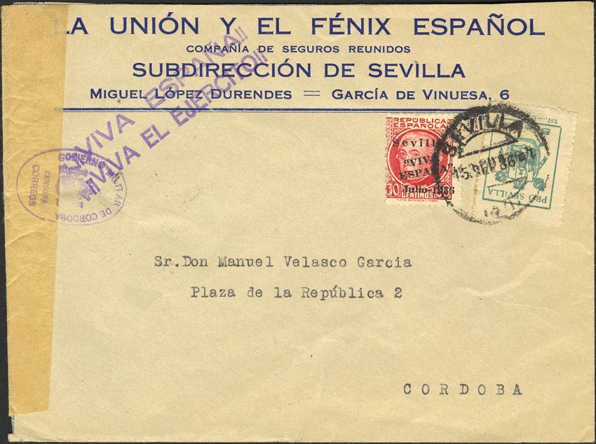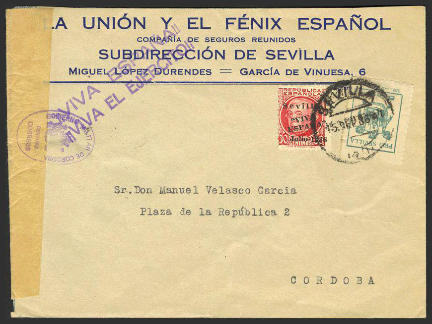 Guerra Civil. Bando Nacional. GOBIERNO MILITAR de CORDOBA / CENSURA CORREOS.