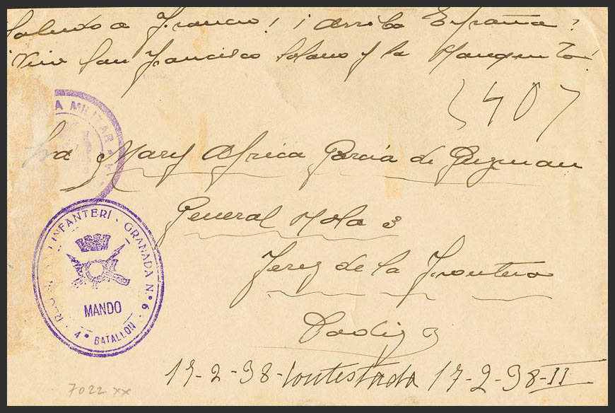 Guerra Civil. Bando Nacional. Franquicia REGIMIENTO INFANTERIA GRANADA Nº6 / 4º BATALLON / MANDO, al dorso llegada. MAGNIFICA.