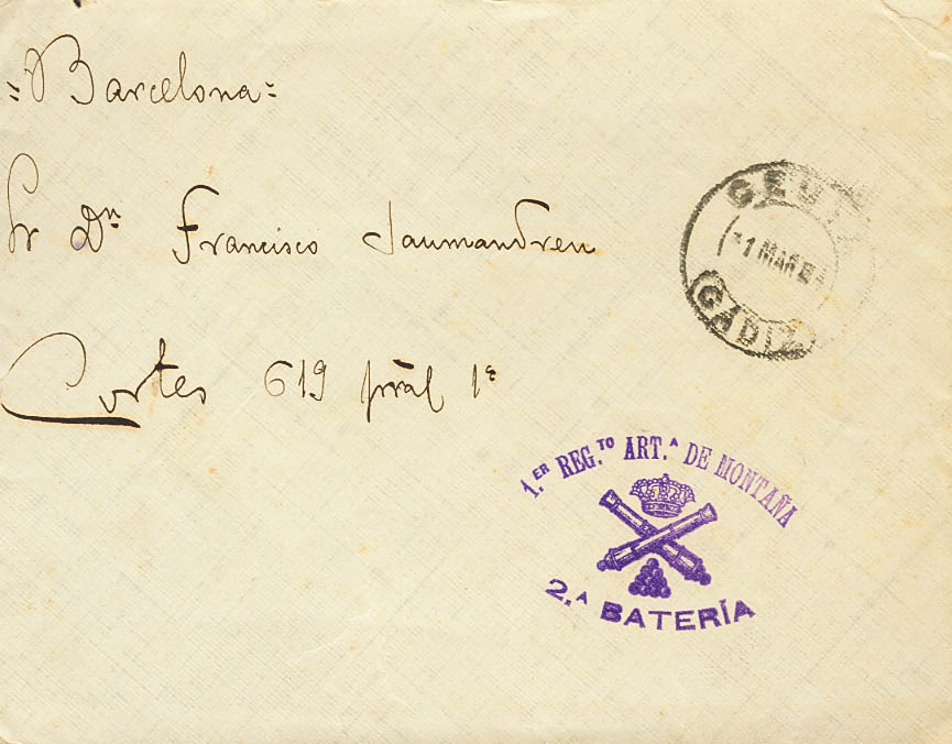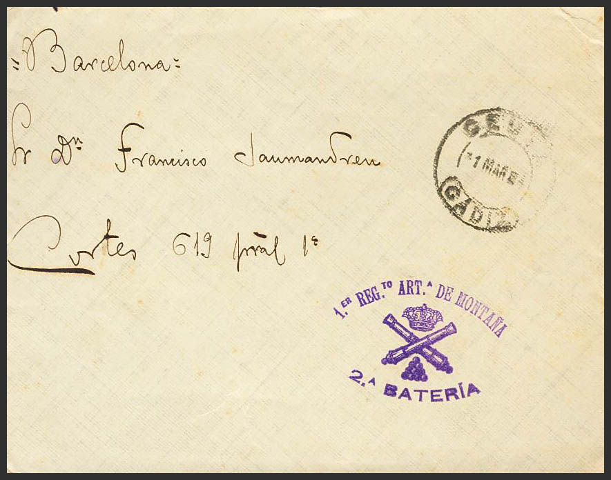 1914. CEUTA a BARCELONA. Marca de franquicia 1º REGTO ARTª DE MONTAÑA / 2ª BATERIA, en violeta. MAGNIFICA Y RARA.