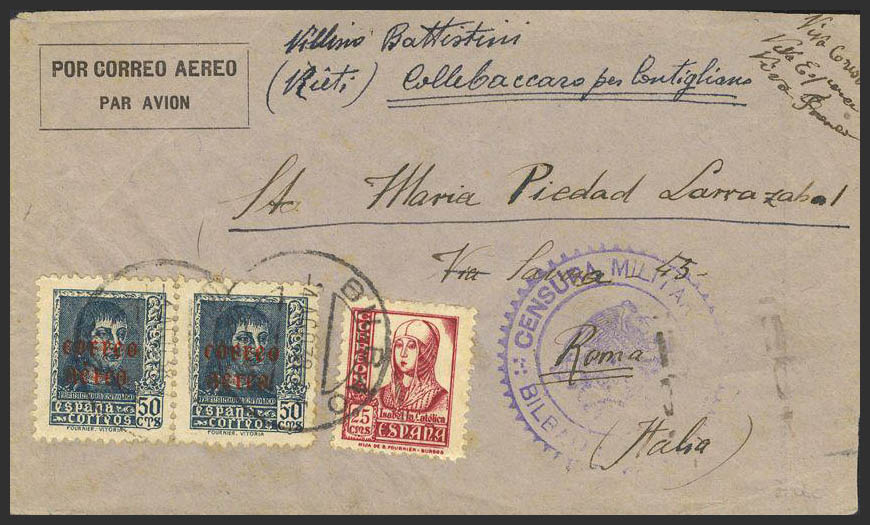 Guerra Civil. Bando Nacional Correo Aéreo. "PAR AVION JUSQU'A ROMA" MAGNIFICA.