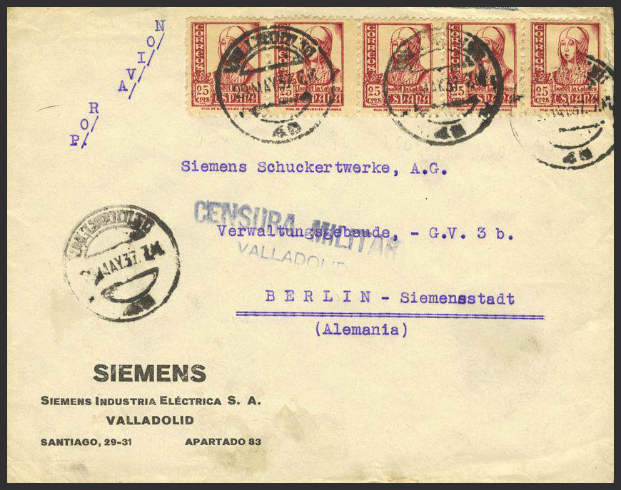 822(5). 1937. 25 cts carmÃn, tira de cinco. VALLADOLID a BERLIN. Matasello VALLADOLID / 40, en el frente CENSURA MILITAR / VALLADOLID, transportada "POR CORREO AEREO". MAGNIFICA.