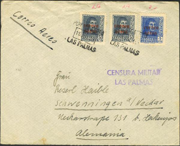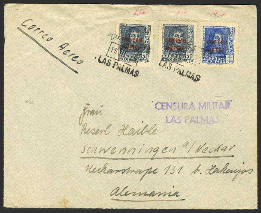 845(2), 846. 1939. 50 cts., dos sellos y 1 pts. LAS PALMAS a SCHWENNINGEN (ALEMANIA). Matasello POR VIA AEREA / LAS PALMAS, en el frente marca CENSURA MILITAR / LAS PALMAS, transportada "POR AVION". MAGNIFICA.