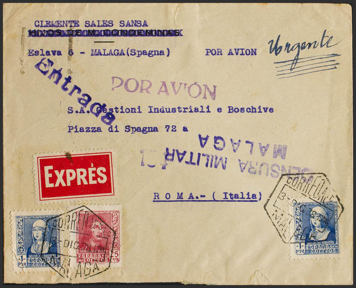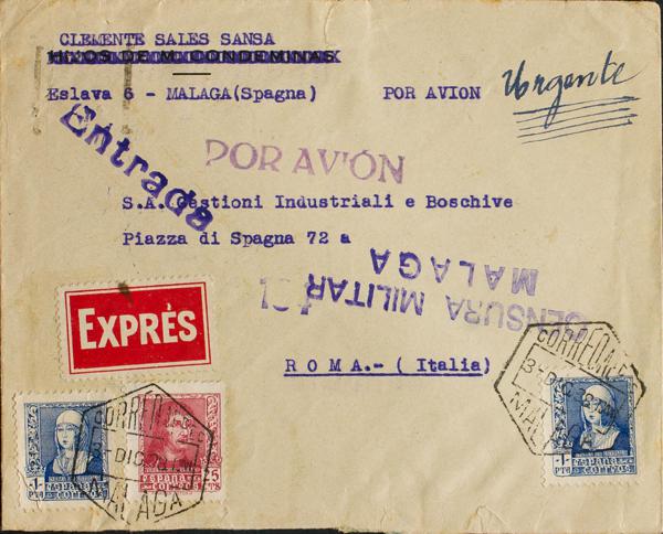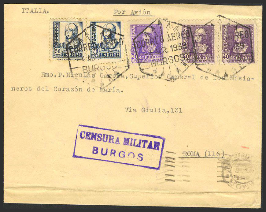 Guerra Civil. Bando Nacional Correo Aéreo. POR AVION JUSQU´A ROMA, en rojo. MAGNIFICA.