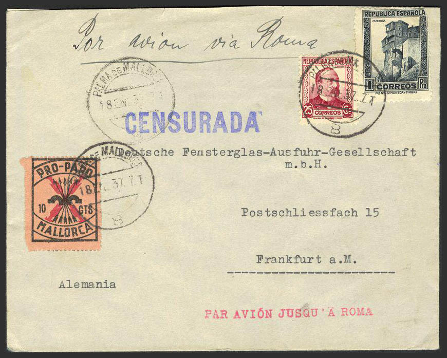 673, 685. 1937. 1 pts pizarra, 25 cts carmÃn y local de 10 cts negro sobre rosa (serie B) PRO PARO (Fesofi 23a). PALMA DE MALLORCA a LANGEDORF (SUIZA). En el frente marca PAR AVION JUSQU´A ROMA. MAGNIFICA.