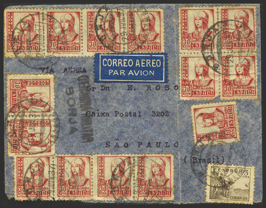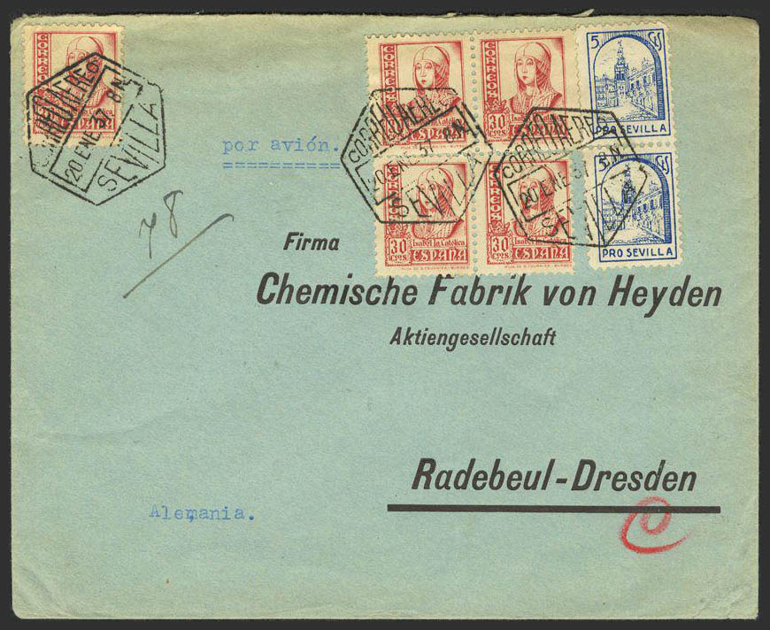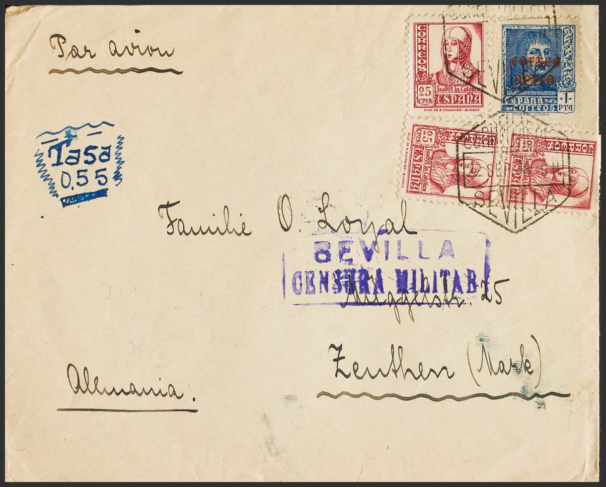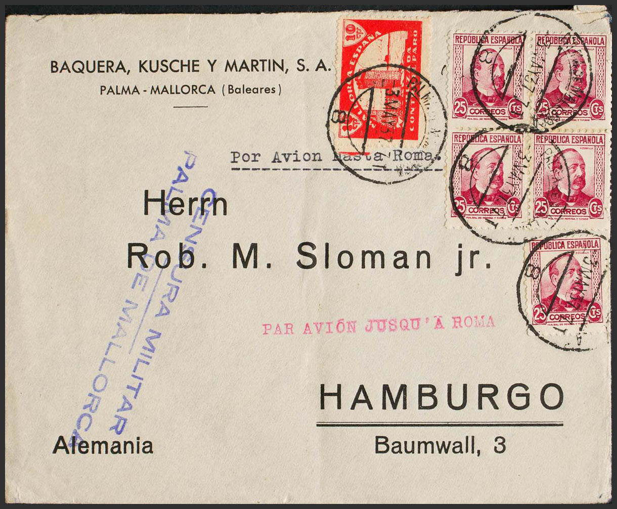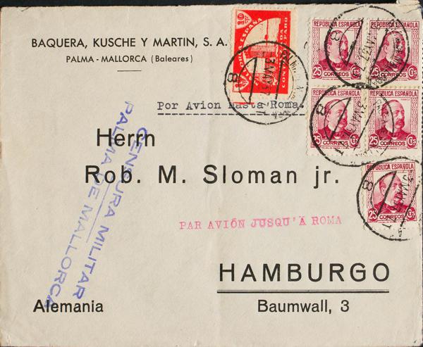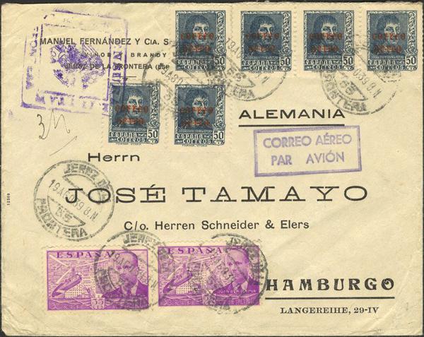 845(6), 882(2). 1938. 50 cts., tira de cuatro y dos sellos y 35 cts., pareja. JEREZ a HAMBURGO (ALEMENIA). Matasello JEREZ DE LA / FRONTERA, transportada por "CORREO AEREO" y marca CENSURA MILITAR / JEREZ DE LA FRONTERA. MAGNIFICA.
