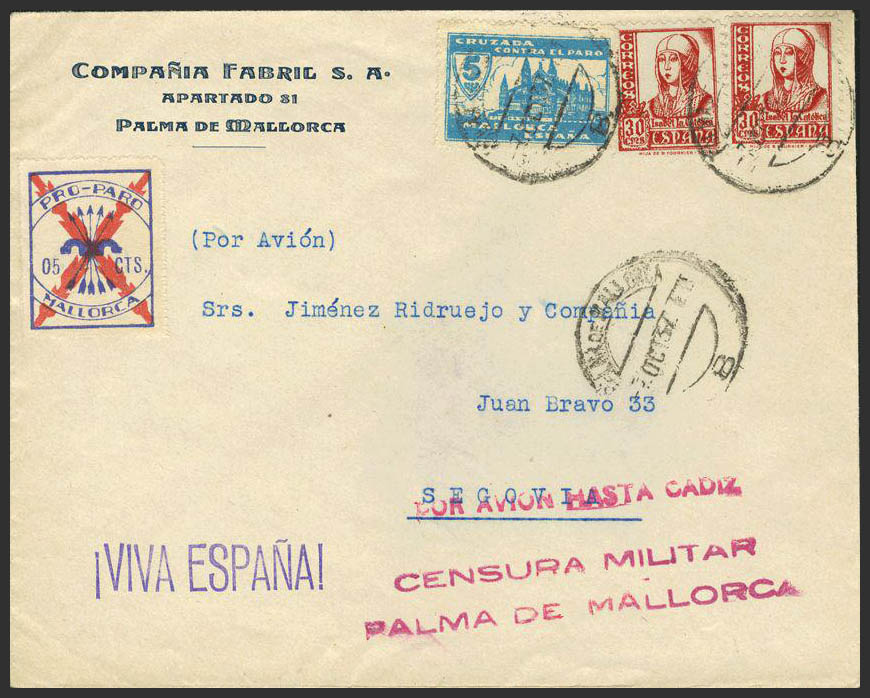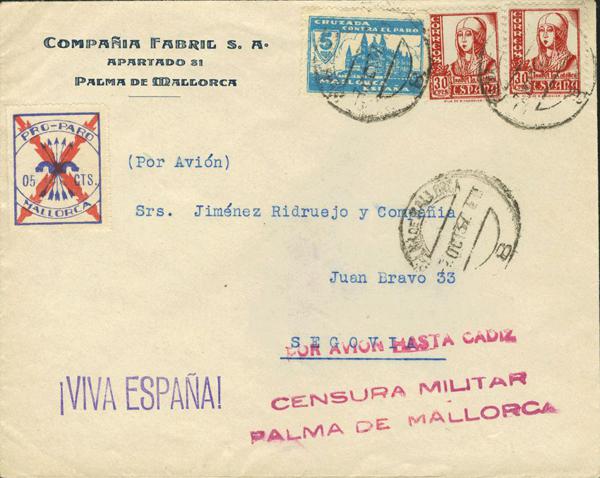 Guerra Civil. Bando Nacional Correo Aéreo. Manuscrito "Por Avión Cádiz-Pollensa", al dorso llegada. MAGNIFICA.