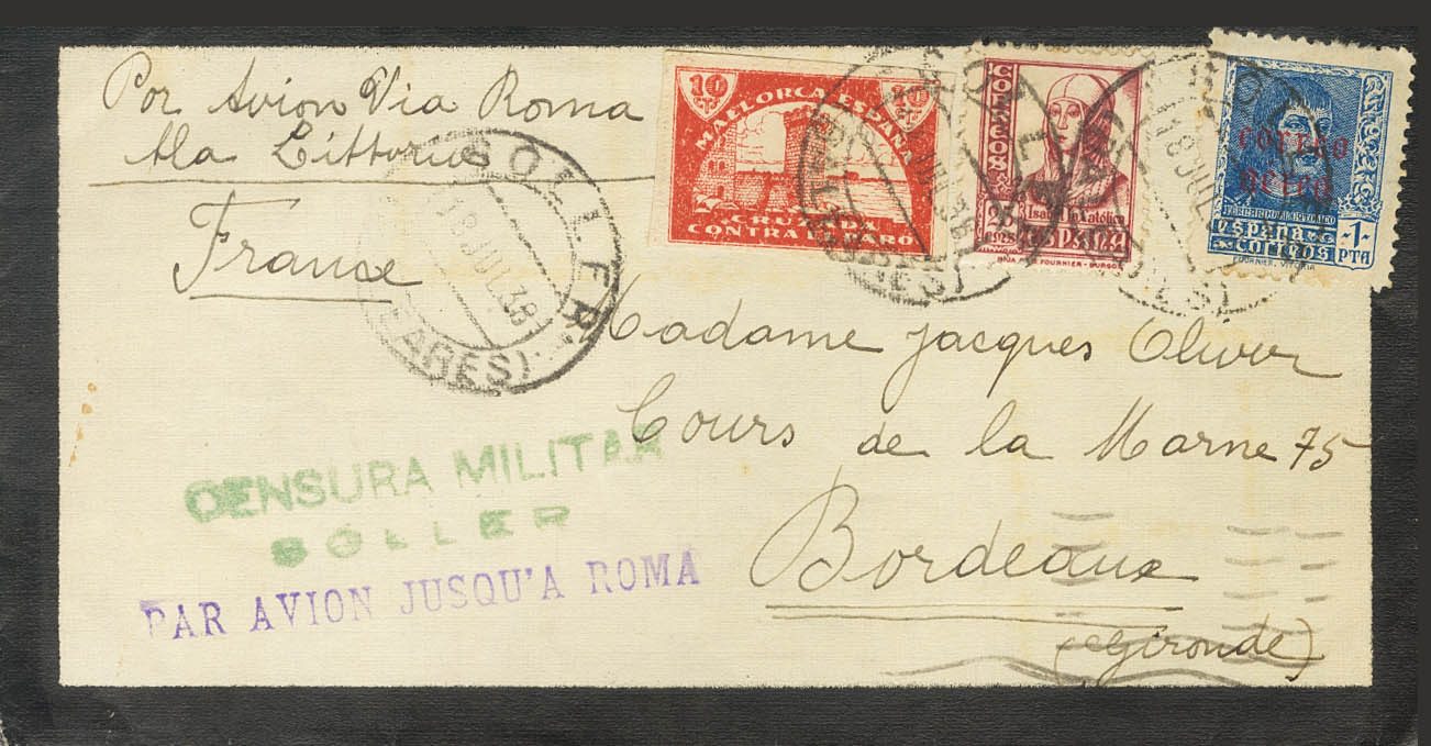 846, 822. 1938. 1 pts azul, 25 cts carmín y 10 cts rojo Benéfico de Mallorca. SOLLER a BURDEOS (FRANCIA). En el frente manuscrito "Por Avión Vía Roma Ala Littoria" y marca PAR AVION JUSQU´A ROMA, en violeta y al dorso llegada. MAGNIFICA.