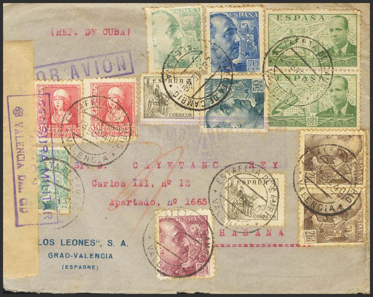 872, 874, 876(2), 857(2), 868. 1940. Diversos valores. VALENCIA a LA HABANA (CUBA). Al dorso tránsito por Sevilla y llegada. BONITA E INUSUAL FRANQUEO.