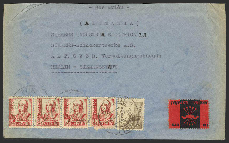 823(4),816. 1937. 5 cts, 50 cts, tira de cuatro y 10 cts viñeta. BURGOS a BERCIN. Matasello BURGOS / (10), transportada "POR CORREO AEREO". MAGNIFICA.