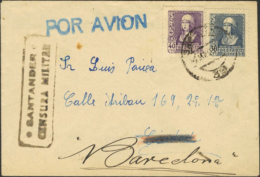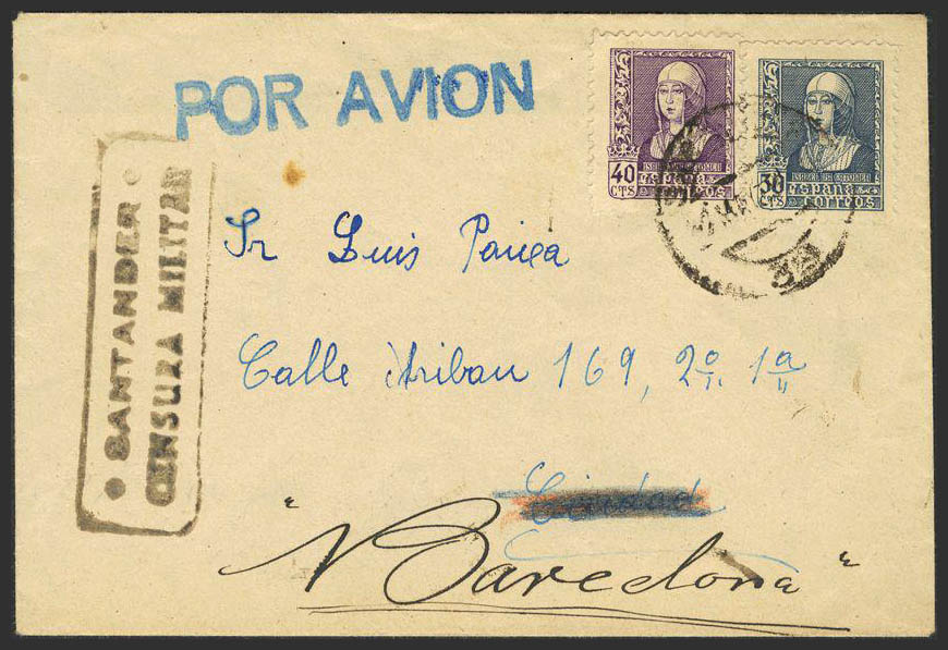 858, 859. 1939. 40 cts violeta y 50 cts pizarra. SANTANDER a BARCELONA. Matasello SANTANDER / 39, en el frente marca SANTANDER / CENSURA MILITAR y transportada "POR AVION". MAGNIFICA.