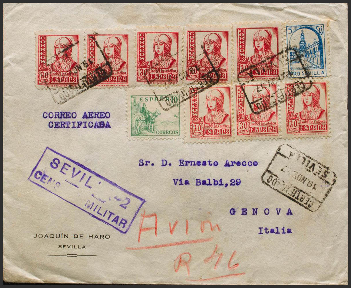 817, 823(8). 1937. 10 cts verde, 30 cts rosa carmín, ocho sellos y benéfico de 5 cts azul. Certificado de SEVILLA a GENOVA (ITALIA). Al dorso llegada. MAGNIFICA.