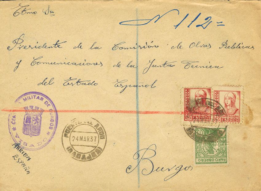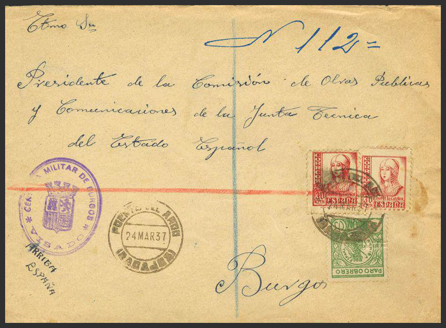 823(2). 1937. 30 cts carmín, dos sellos y 5 cts (viñeta paro obrero). Carta certificada de PUENTE DEL ARCO a BURGOS. Matasello PUENTE DEL ARCO / (BADAJOZ), en el frente marca CENSURA MILITAR DE BURGOS / VISADO. MAGNIFICA.