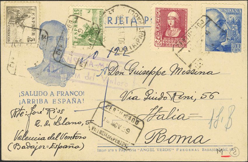 856, 874, 916, 917. 1939. 5 cts, 15 cts, 25 cts y 70 cts. Tarjeta de VALENCIA DEL VENTOSO a ROMA. Matasello CERTIFICADO / VALENCIA DEL VENTOSO, en el frente marca CENSURA MILITAR / VALENCIA DEL VENTOSO. MAGNIFICA Y RARA.