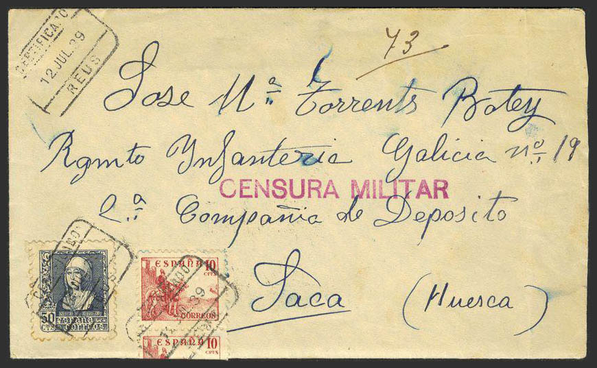 818(3), 859. 1939. 10 cts., tira de tres y 50 cts. REUS a JACA. Matasello REUS / CERTIFICADO, en el frente marca CENSURA MILITAR, al dorso llegada. MAGNIFICA.