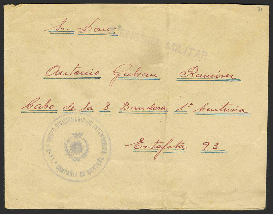 (1936ca). Compañía de Subsistencia de la 122 División al Cabo de la 8ª Bandera 1ª Centuria. Marca 2º GRUPO DIVISIONARIO DE INTENDENCIA / 11ª COMPAÑIA DE MONTAÑA. MAGNIFICA.
