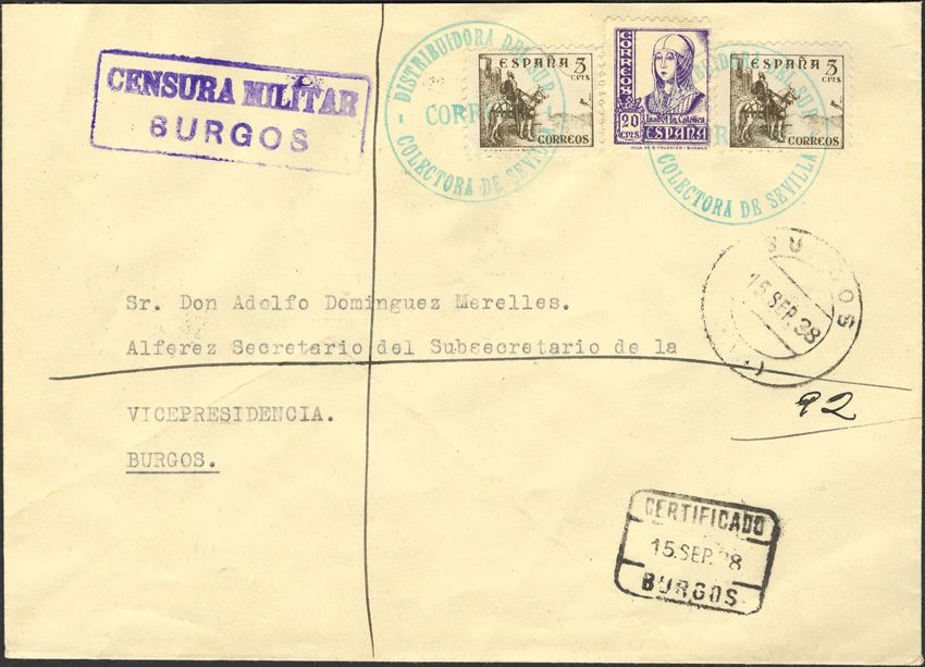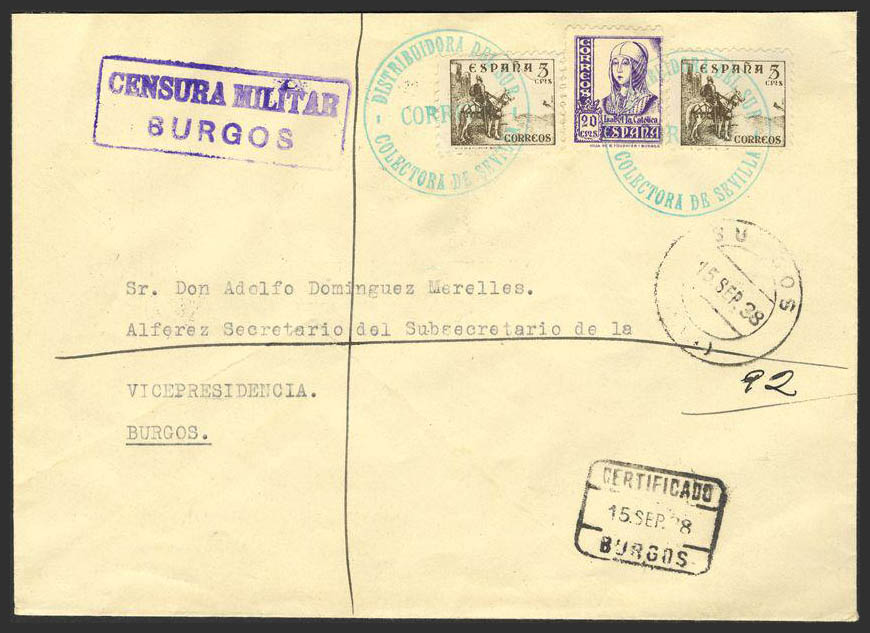 Guerra Civil. Bando Nacional Correo Certificado. Al dorso llegada.