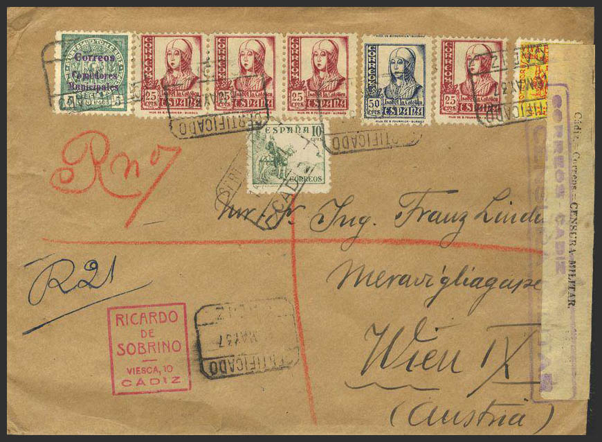 817, 822(4), 825. 1937. 10 cts, 25 cts cuatro sellos y 50 cts. CADIZ a VIENA. MAGNIFICA.