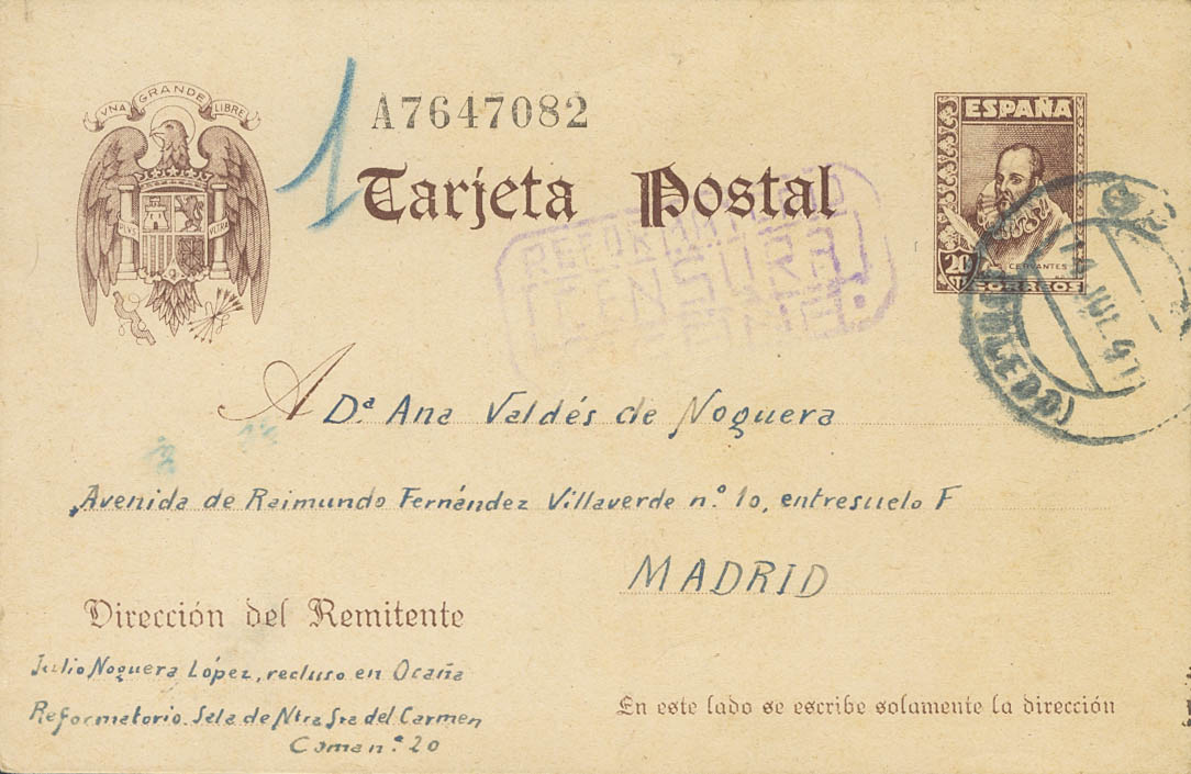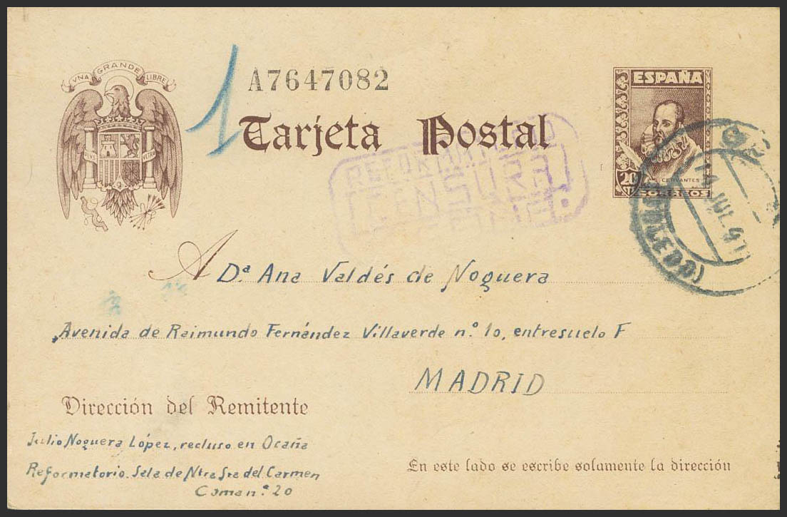 EP86. 1941. 20 cts castaño sobre Tarjeta Entero Postal de OCAÑA a MADRID, remitida por un recluso del Reformatorio de Nª Sª del Carmen. En el frente marca REFORMATORIO / CENSURA / OCAÑA, en violeta. MAGNIFICA.