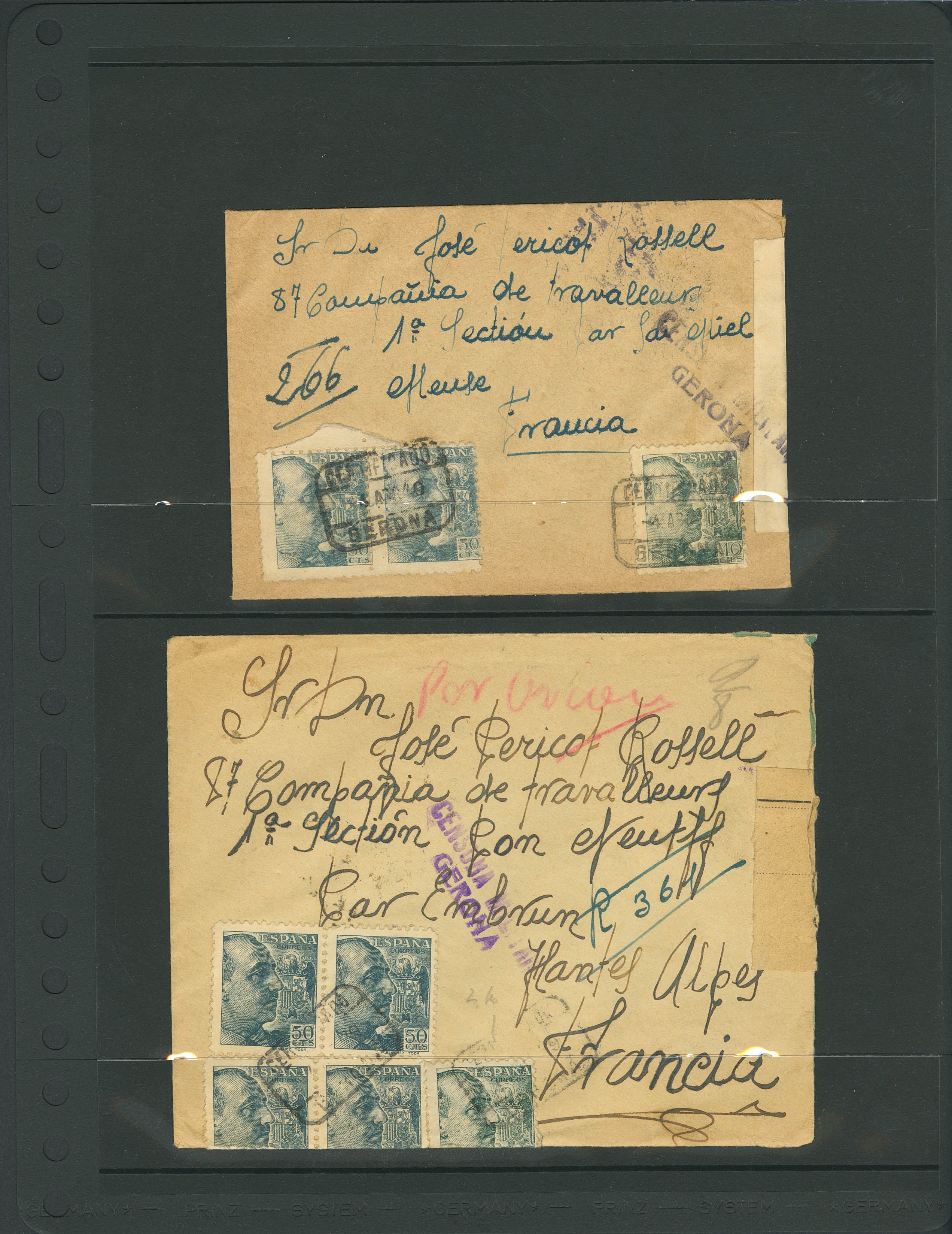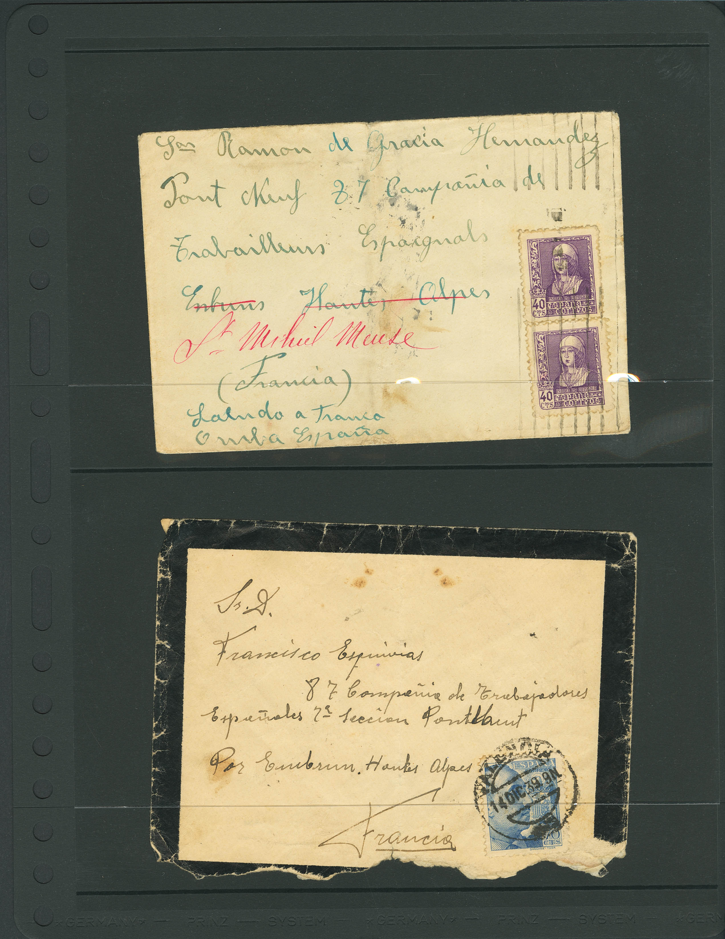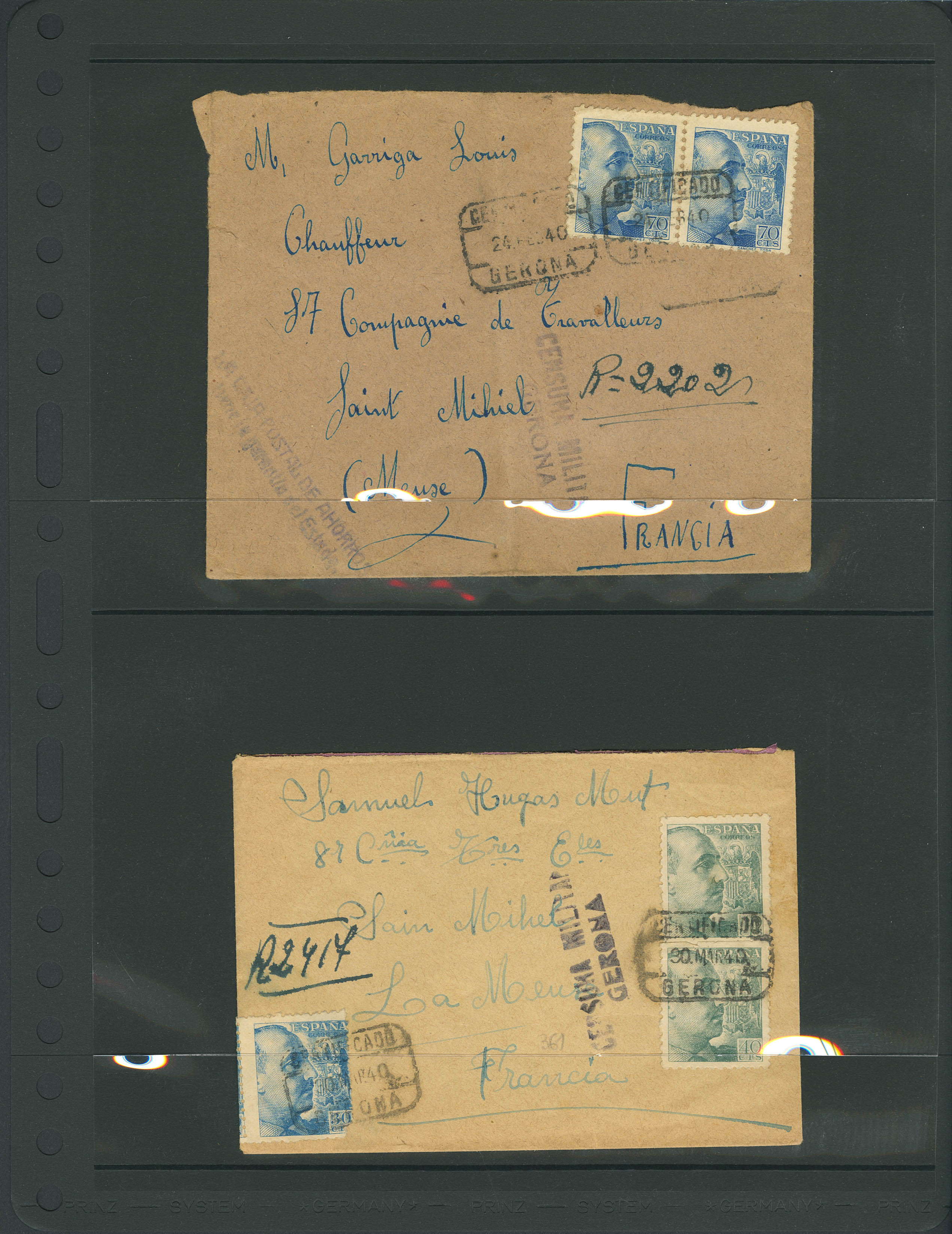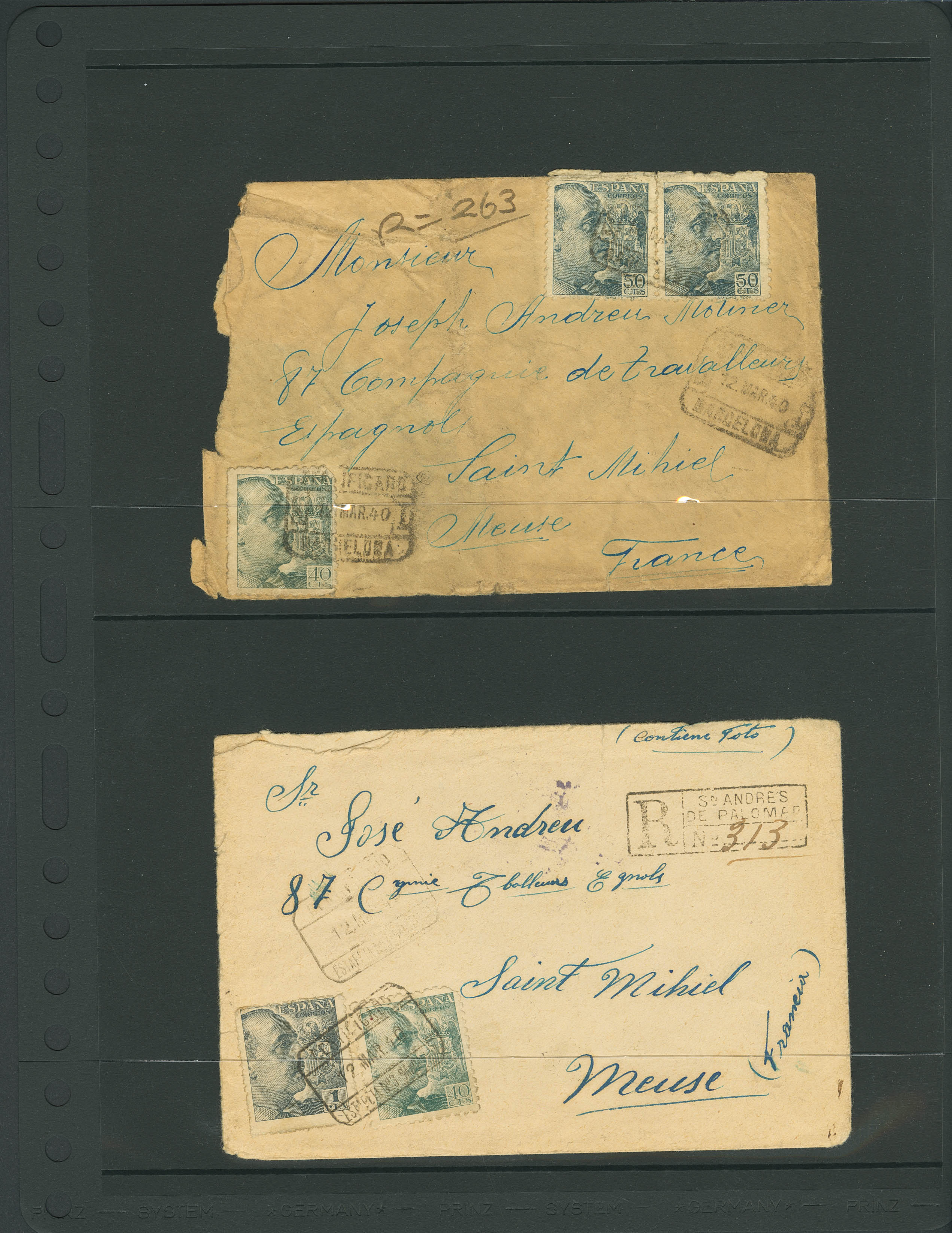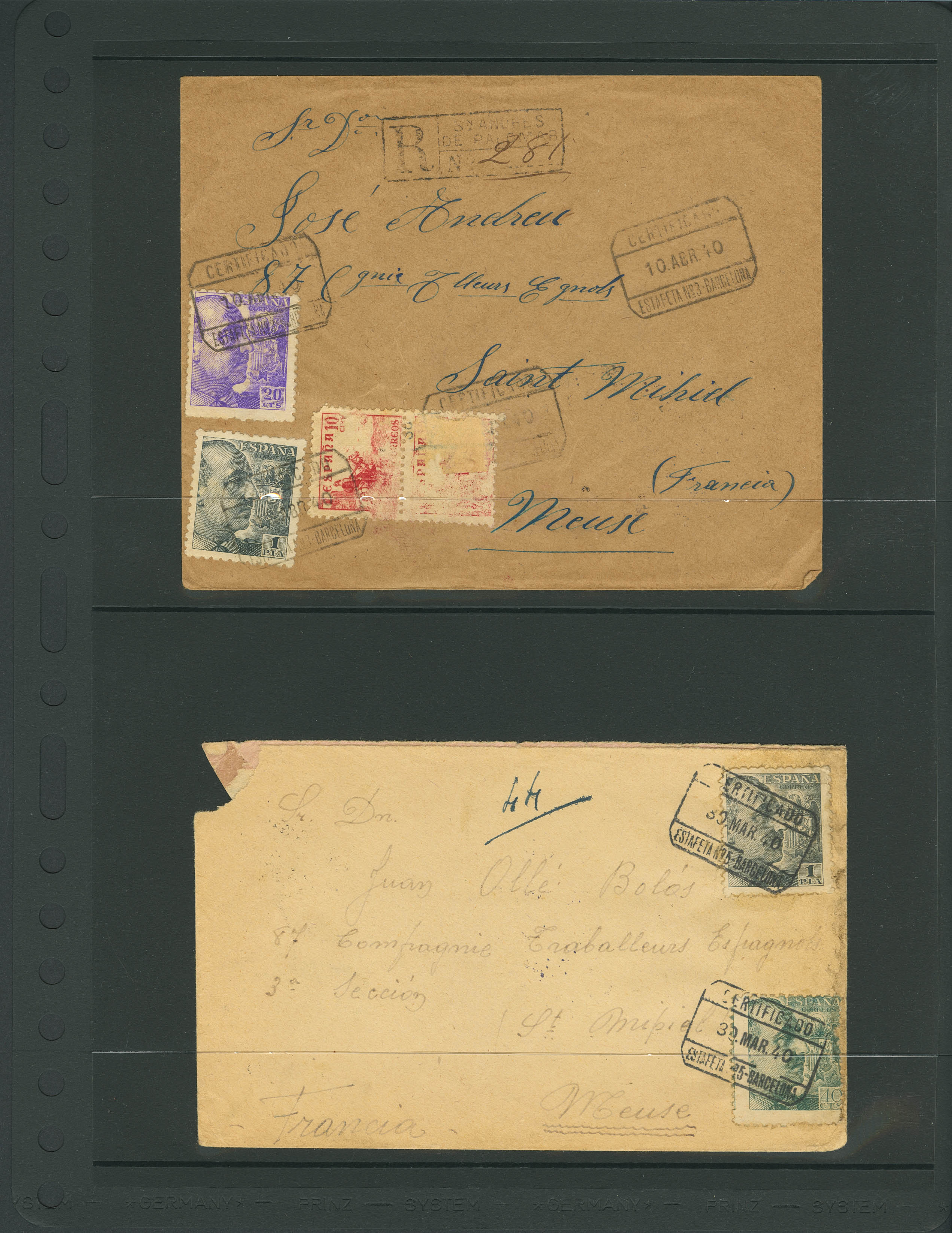 (1939ca). InteresantÃsimo conjunto de diez cartas con origen en Barcelona, Gerona y Valencia, dirigidas a prisioneros internados en la 87ª CompañÃa de Trabajadores Españoles en Saint Michel le Meuse (Francia), algunas circuladas por correo certificado y una reexpedida. MAGNIFICA Y MUY RARO E INTERESANTE CONJUNTO.