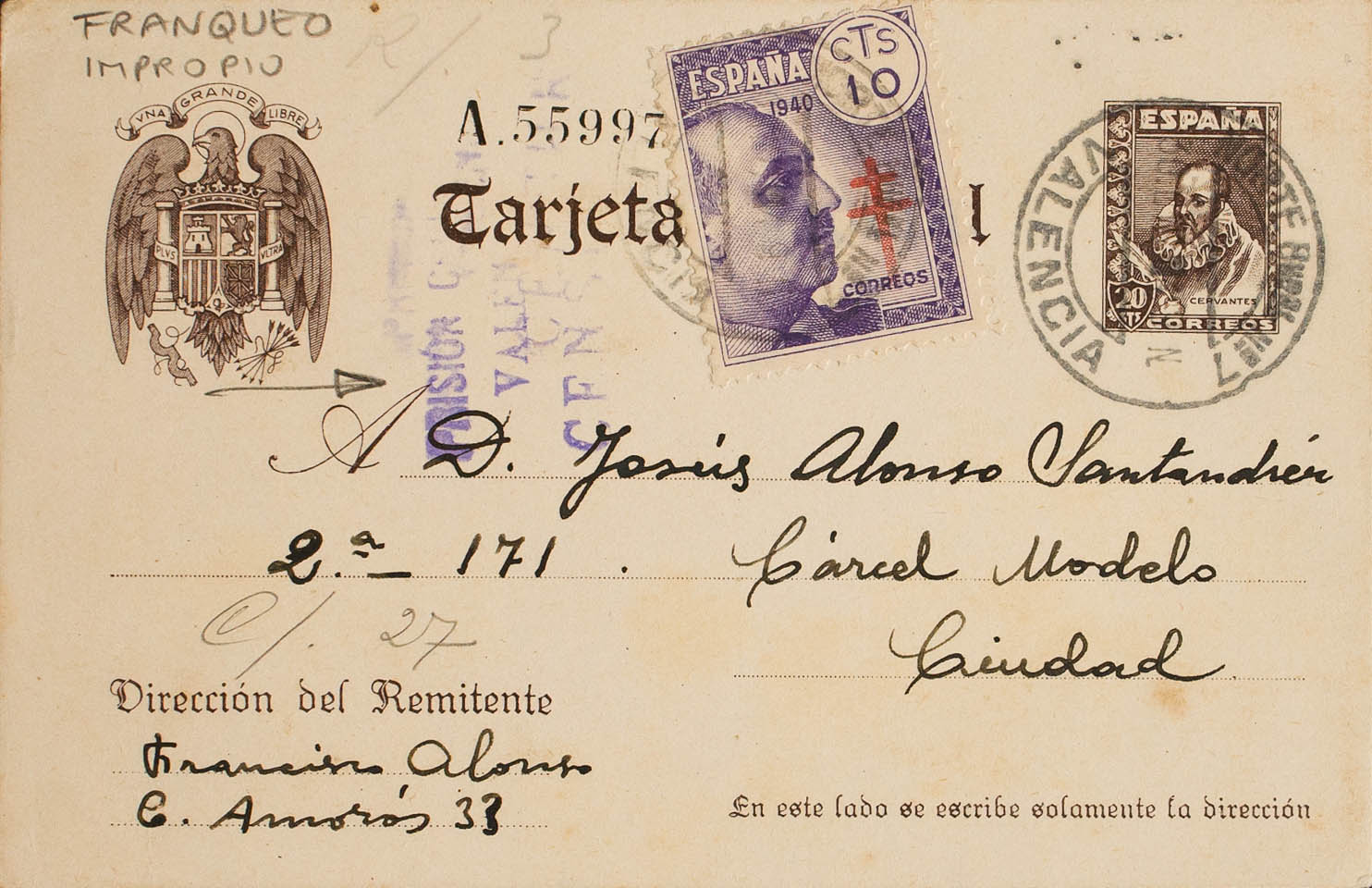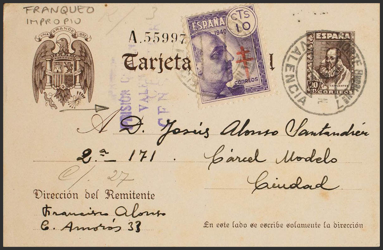 EP83, 936. 1940. 20 cts castaño sobre Tarjeta Entero Postal Correo Interior de VALENCIA, con franqueo complementario de 10 cts violeta. En el frente marca de censura de la Carcel Modelo, en violeta. MAGNIFICA E INUSUAL FRANQUEO COMPLEMENTARIO.