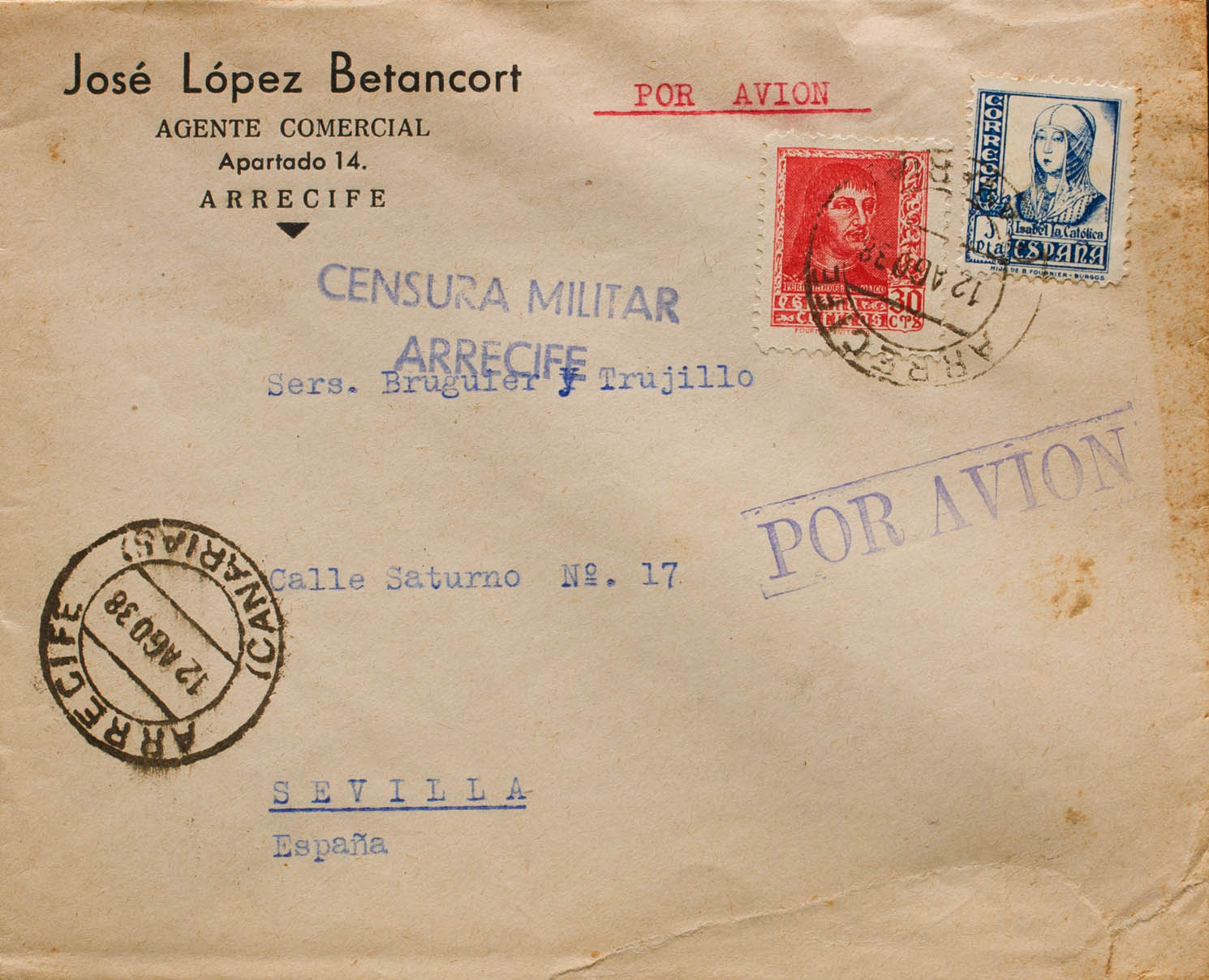 844, 828. 1938. 30 cts rojo y 1 pts azul. ARRECIFE a SEVILLA. En el frente marca CENSURA MILITAR / ARRECIFE, en violeta. MAGNIFICA Y RARA.
