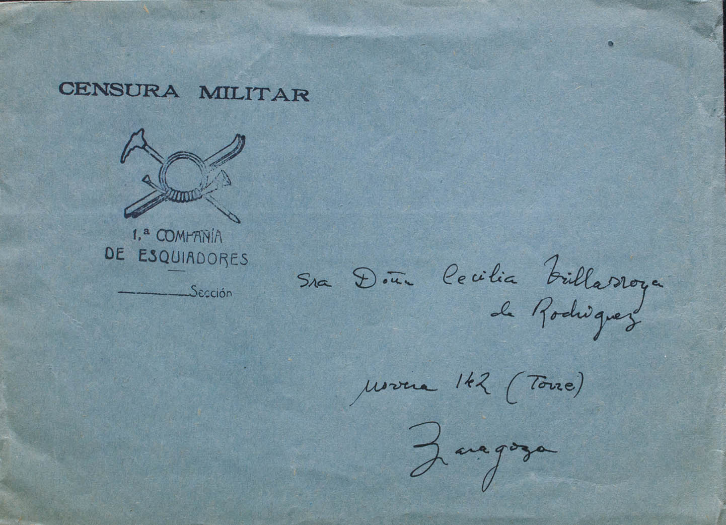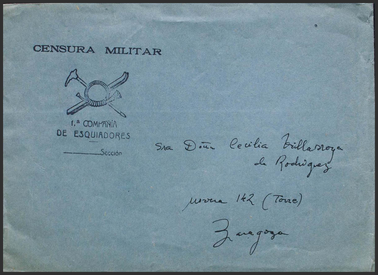 (1937ca). Dirigida a ZARAGOZA. Marca de franquicia 1ª COMPAÑIA / DE ESQUIADORES, en negro. MAGNIFICA Y RARA.