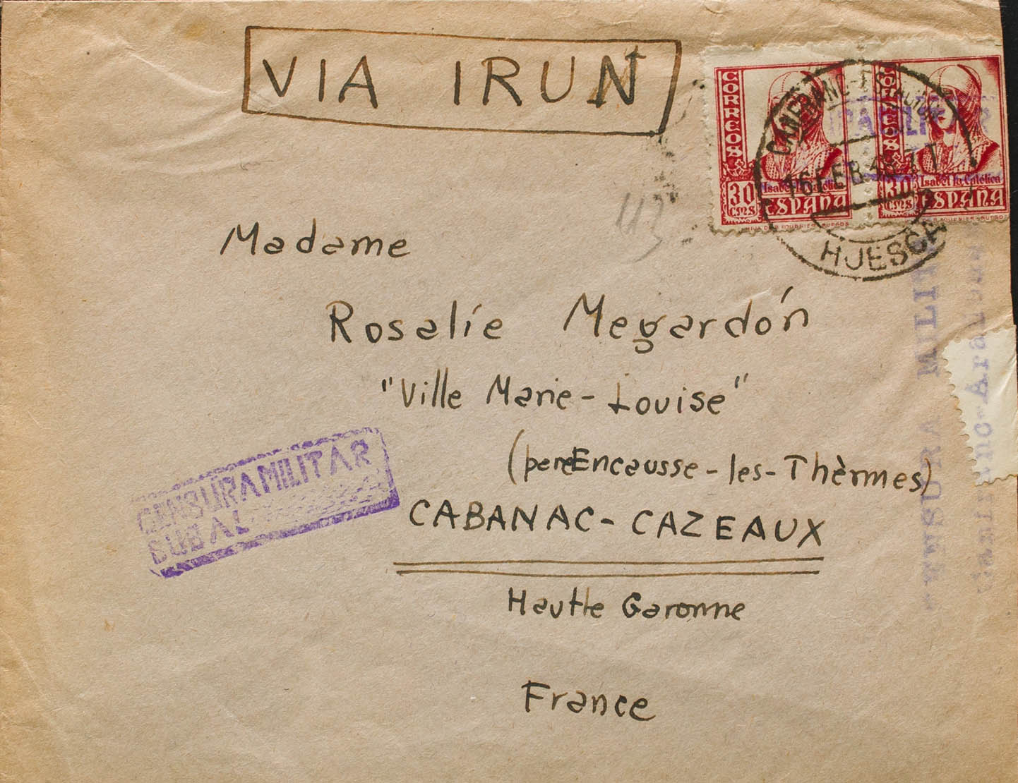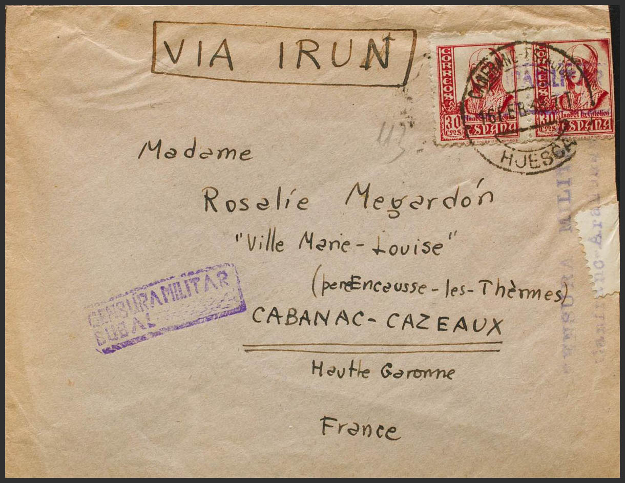 Guerra Civil. Censura Militar Bando Nacional. CENSURA MILITAR / BUBAL (HUESCA), al dorso llegada. MAGNIFICA.