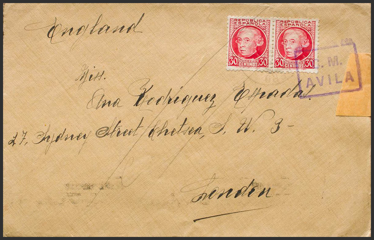 687(2). 1937. 30 cts carmín, pareja. MARTIHERRERO a LONDRES (GRAN BRETAÑA). Matasellos MARTIHERRERO y C.M. / AVILA (Censura), en violeta, al dorso tránsito. MAGNIFICA.