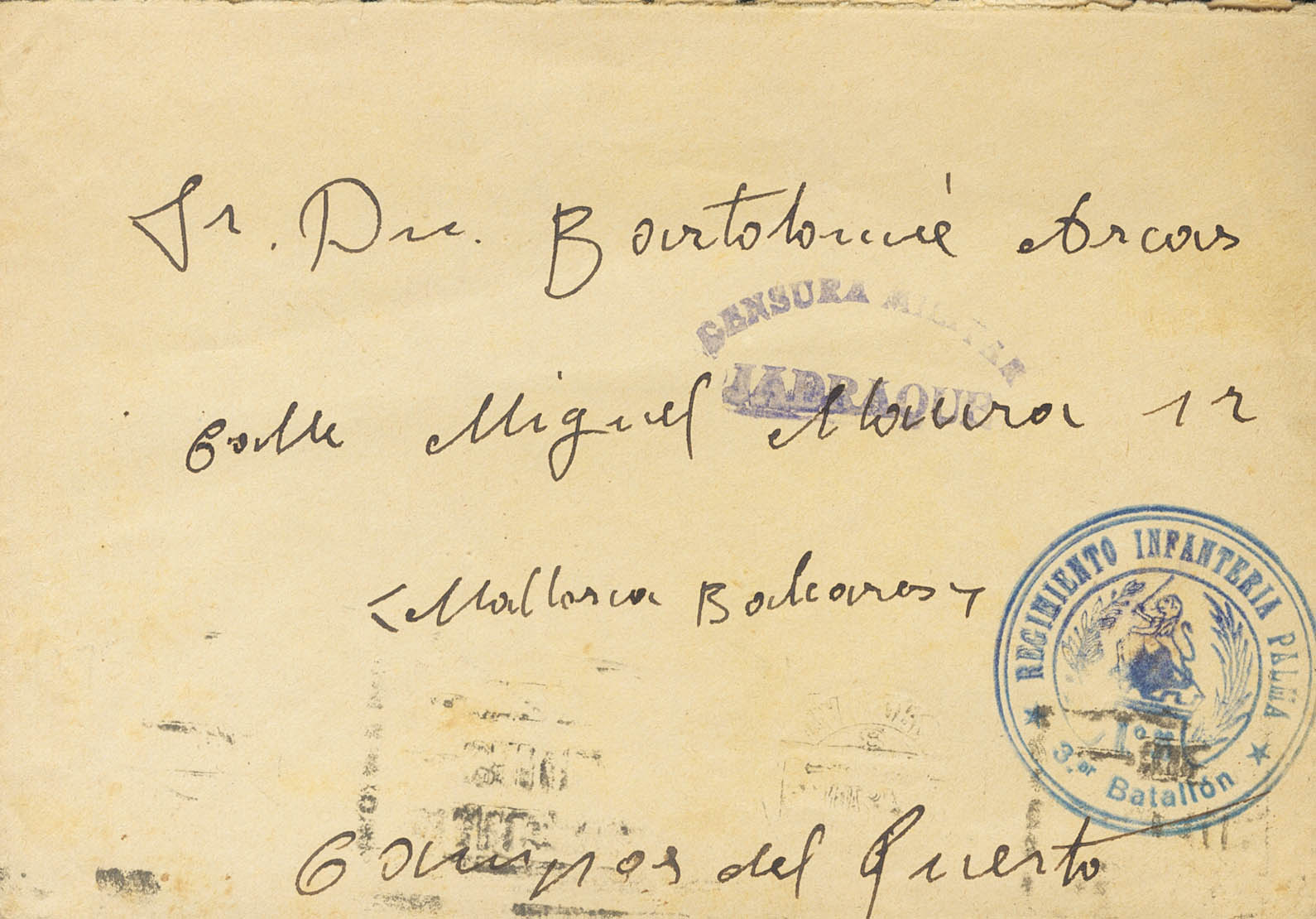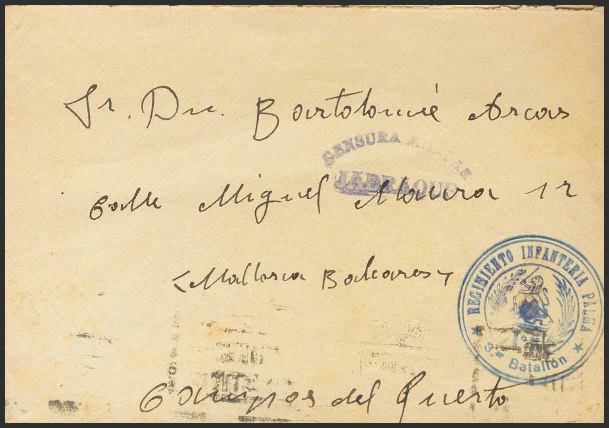 1937. ESPINOSA DE HENARES (GUADALAJARA) a CAMPOS DEL PUERTO (BALEARES). Marca de franquicia REGIMIENTO INFANTERIA PALMA / 3ER BATALLON, en azul y CENSURA MILITAR / JADRAQUE y al dorso llegada. MAGNIFICA Y RARA.
