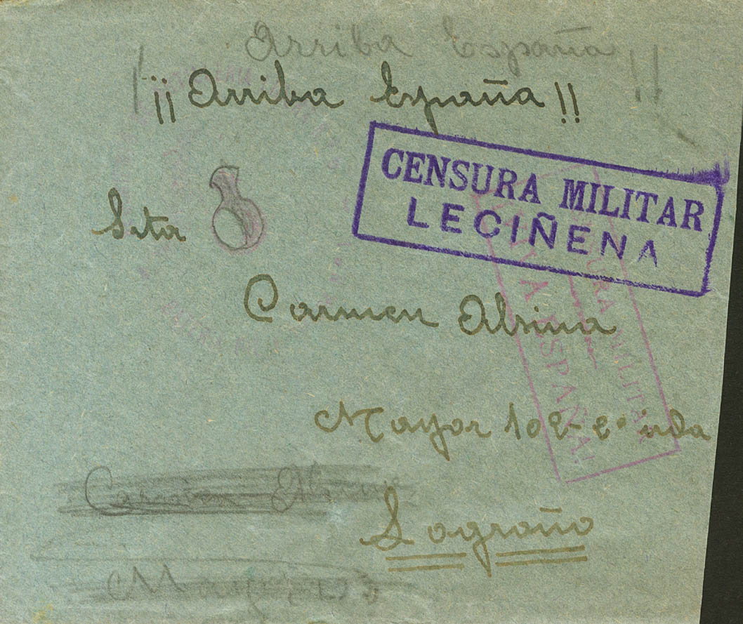 1938. LECIÑENA (ZARAGOZA) a LOGROÑO. Marca CENSURA MILITAR / LECIÑENA, en violeta. MAGNIFICA Y RARA.